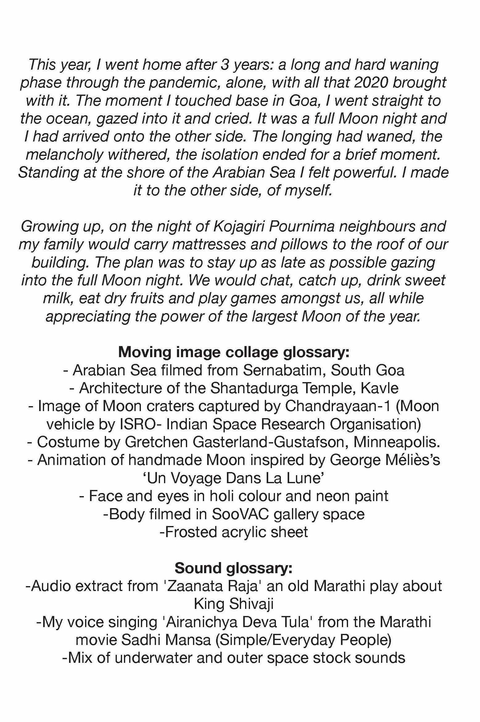 ‘पौर्णिमा : Gazing Into The Full Moon Night’ is a poetic, conceptual and intimate exploration of the SooVAC gallery space. The word पौर्णिमा pronounced Pour-nima is a Marathi term for the Full Moon, inciting celebration to mark the beginning and the end of the Moon’s cycle. Personally, पौर्णिमा is the night of passage: into power, into a sense of wonder, a burning curiosity, an excited calm.