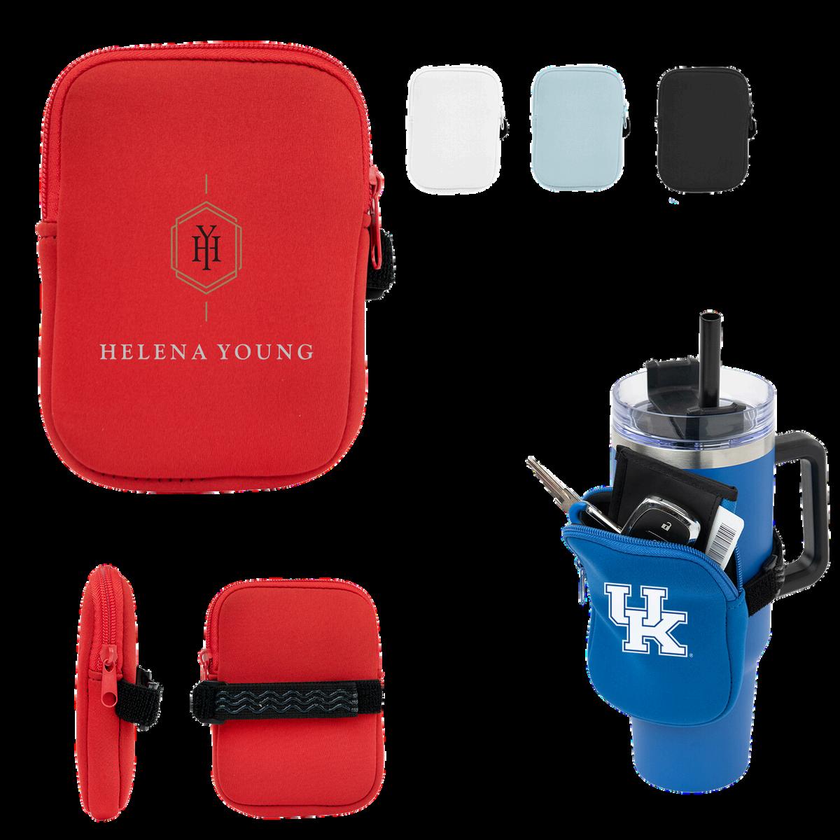 Neoprene pouch with zippered main compartment attachable to a 40 oz. tumbler featuring an adjustable belt with hook and loop closure and rubber grips to prevent sliding.
