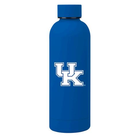 Stainless steel water bottle with smooth rubberized finish and screw-on lid. Double wall construction for Insulation with a wide mouth opening