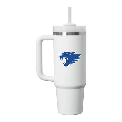 40 oz. stainless steel tumbler keeps drinks cold 24 hours and hot up to 8. Features a screw-on, spillresistant lid with straw hole and 12" straw