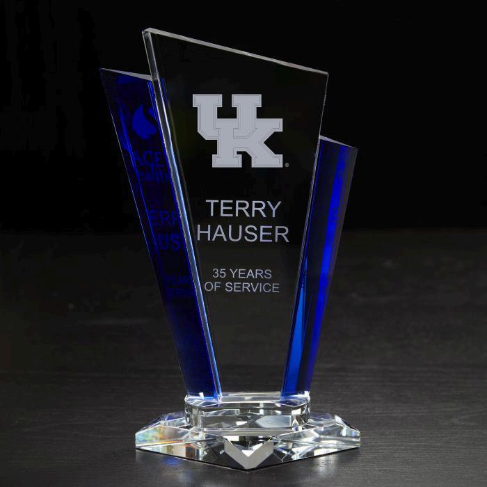 Angled blue accents make this piece stand out among the rest. Large imprint areas and steady clear bases finish out the piece.