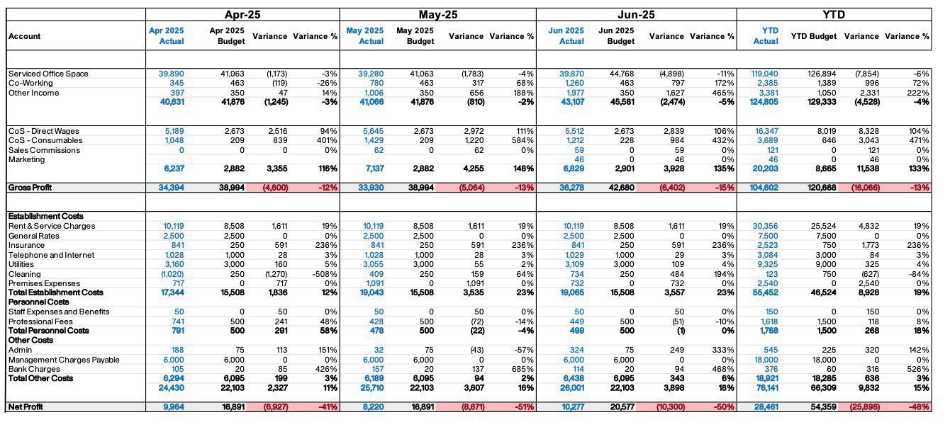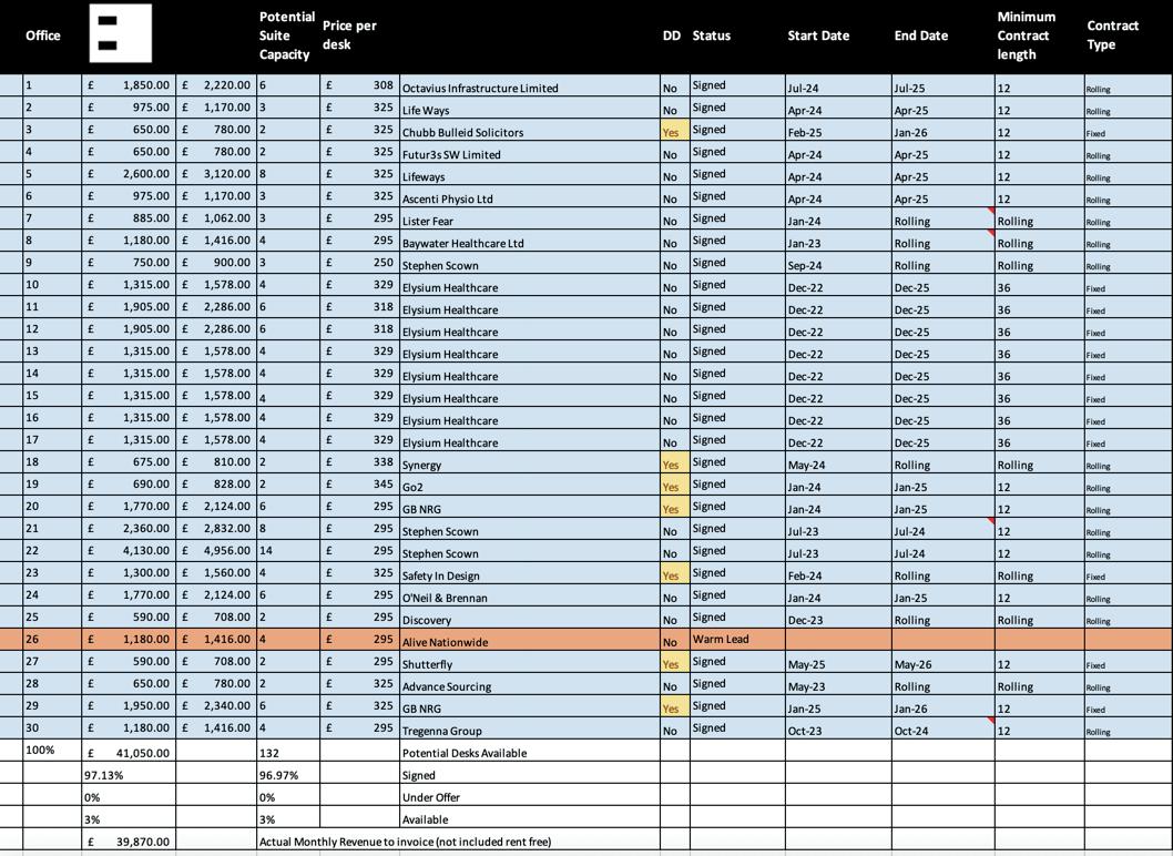 Sales & Marketing → While only one office is currently available, we anticipate two larger spaces may become vacant this autumn due to downsizing or planned departures. Although we’ve not yet received formal notice, we are actively marketing the potential availability. We are currently managing three live enquiries — one of which is for a 20-desk space — reflecting ongoing demand and positive pipeline activity.
