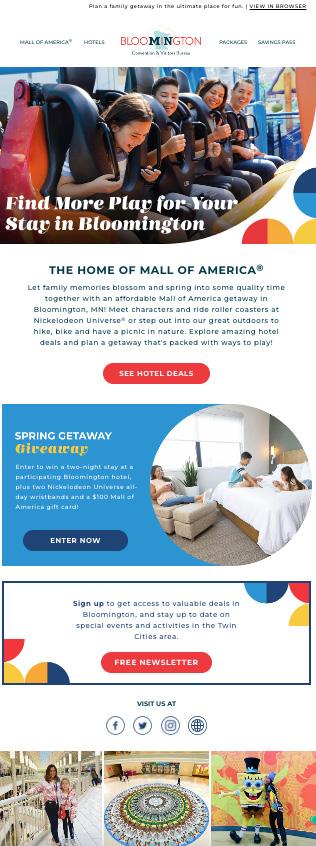 From its offices adjacent to Mall of America and overlooking the runways at Minneapolis-St. Paul International Airport (ranked by travelers as the best airport in North America), Bloomington Minnesota Travel & Tourism (BMTT) moved aggressively to welcome visitors to Minnesota and to make sure they had a comfortable and rewarding experience. Along with marketing Bloomington’s convenient location, BMTT continued to promote the variety of hotel options available, a major selling point for the destination.