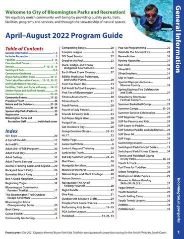 Composting Basics....................................28 Couples League........................................... 6 DIY Seed Bombs.........................................27 Drool in the Pool........................................22 Duck, Dodge, and Throw Dodgeball Tournament.........................22 Earth Week Creek Cleanup......................27 Edible, Medicinal, Poisonous, and Useful Plants....................................28 Excel Tae Kwon Do....................................33 Fall Adult Softball Leagues......................34 First Tee of Bloomington.........................23 Fitness Assessments.................................30 FitnessCoach..............................................31 Fossil Frenzy...............................................28 Fourth of July Parade................................21 Friends & Family Sails...............................33 Full Moon Night Hike................................28 Fungal Fun..................................................28 Get Outdoors Day......................................28 Group Exercise Classes...................... 32–33 H.I.I.T............................................................32 Hatha Yoga.................................................32 Junior Golf Clinic.......................................... 6 Junior Lifeguard Training........................10 Junk in the Trunk.......................................22 Kid City Summer Camps.................... 24–25 Mad Paws....................................................18 Marigolds for Mom....................................18 Movies in the Parks...................................20 Natural Rope and Plant Cordage............28 Nature Sounds...........................................17 Navigation: The Art of Finding Yourself.....................................28 Night Paddle...............................................27 One Pass......................................................31 Outdoor Art & Nature Crafts....................29 Peoples Park Concert Series....................19 Performing Arts Series....................... 18–19 PGA Junior League...................................... 6 Pickleball........................................13, 26, 33