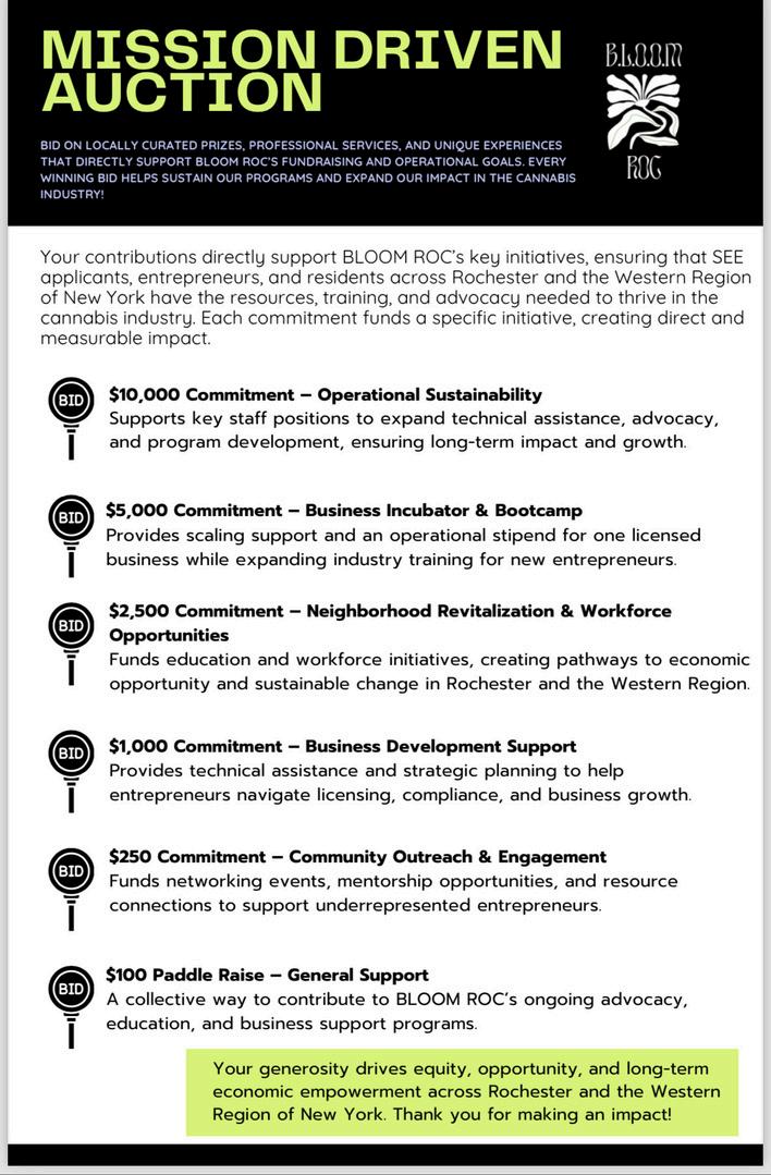 Your support tonight is a direct investment in change Every dollar raised, every partnership formed, and every conversation sparked here tonight plays a role in reshaping the cannabis landscape into one that is diverse, sustainable, and communityfocused By contributing to this cause, you are not just supporting BLOOM ROC you are supporting generational wealth-building, job creation, and the economic revitalization of communities that have been left behind for too long