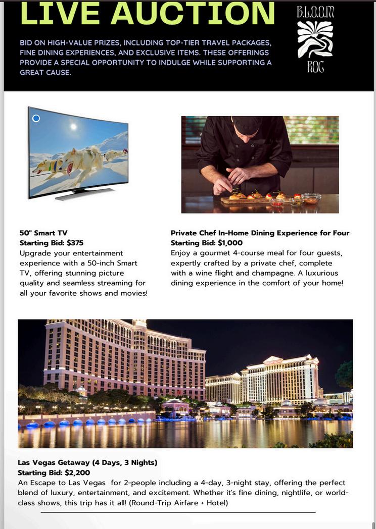 BID ON HIGH-VALUE PRIZES, INCLUDING TOP-TIER TRAVEL PACKAGES, FINE DINING EXPERIENCES, AND EXCLUSIVE ITEMS. THESE OFFERINGS PROVIDE A SPECIAL OPPORTUNITY TO INDULGE WHILE SUPPORTING A GREAT CAUSE.