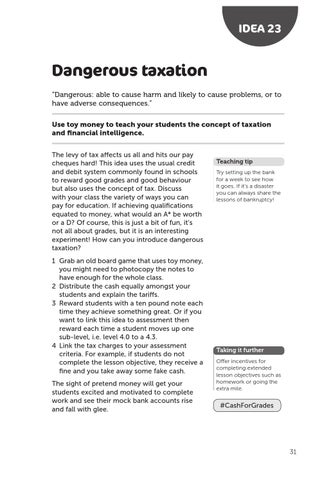 Dangerous taxation âDangerous: able to cause harm and likely to cause problems, or to have adverse consequences.â Use toy money to teach your students the concept of taxation and financial intelligence. The levy of tax affects us all and hits our pay cheques hard! This idea uses the usual credit and debit system commonly found in schools to reward good grades and good behaviour but also uses the concept of tax. Discuss with your class the variety of ways you can pay for education. If achieving qualifications equated to money, what would an A* be worth or a D? Of course, this is just a bit of fun, itâs not all about grades, but it is an interesting experiment! How can you introduce dangerous taxation? 1 Grab an old board game that uses toy money, you might need to photocopy the notes to have enough for the whole class. 2 Distribute the cash equally amongst your students and explain the tariffs. 3 Reward students with a ten pound note each time they achieve something great. Or if you want to link this idea to assessment then reward each time a student moves up one sub-level, i.e. level 4.0 to a 4.3. 4 Link the tax charges to your assessment criteria. For example, if students do not complete the lesson objective, they receive a fine and you take away some fake cash. The sight of pretend money will get your students excited and motivated to complete work and see their mock bank accounts rise and fall with glee.