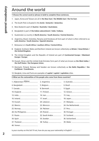 Around the world 1 Choose the correct word or phrase in bold to complete these sentences. 1. Japan, Korea and Taiwan are all in the Near East / the Middle East / the Far East. 2. The South Pole is situated in the Arctic / Antarctic / Antarctica. 3. New Zealand is part of Austria / Australia / Australasia. 4. Bangladesh is part of the Indian subcontinent / India / Indiana. 5. Guatemala is a country in North America / South America / Central America. 6. Argentina, Brazil, Colombia, Panama and Honduras all form part of what is often referred to as Latin America / South America / Spanish America. 7. Botswana is in South Africa / southern Africa / Central Africa. 8. England, Scotland, Wales and Northern Ireland are known collectively as Britain / Great Britain / the United Kingdom. 9. The United Kingdom and the Republic of Ireland are part of Continental Europe / Mainland Europe / Europe. 10. Kuwait, Oman and the United Arab Emirates form part of what are known as the West Indies / the Gulf States / the European Union. 11. Denmark, Finland, Norway and Sweden are known collectively as the Baltic Republics / the Caribbean / Scandinavia. 12. Bangkok, Lima and Tunis are examples of capital / capitol / capitalism cities. 2 What are the nationalities of the people who come from these countries? Afghan 1. Afghanistan................................