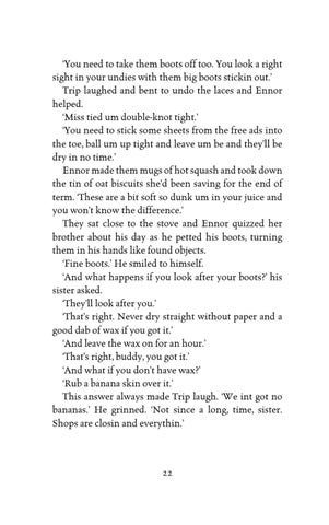 ‘You need to take them boots off too. You look a right sight in your undies with them big boots stickin out.’ Trip laughed and bent to undo the laces and Ennor helped. ‘Miss tied um double-knot tight.’ ‘You need to stick some sheets from the free ads into the toe, ball um up tight and leave um be and they’ll be dry in no time.’ Ennor made them mugs of hot squash and took down the tin of oat biscuits she’d been saving for the end of term. ‘These are a bit soft so dunk um in your juice and you won’t know the difference.’ They sat close to the stove and Ennor quizzed her brother about his day as he petted his boots, turning them in his hands like found objects. ‘Fine boots.’ He smiled to himself. ‘And what happens if you look after your boots?’ his sister asked. ‘They’ll look after you.’ ‘That’s right. Never dry straight without paper and a good dab of wax if you got it.’ ‘And leave the wax on for an hour.’ ‘That’s right, buddy, you got it.’ ‘And what if you don’t have wax?’ ‘Rub a banana skin over it.’ This answer always made Trip laugh. ‘We int got no bananas.’ He grinned. ‘Not since a long, time, sister. Shops are closin and everythin.’