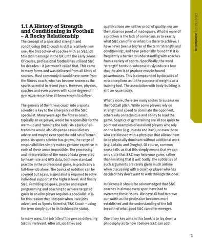 qualifications are neither proof of quality, nor are their absence proof of inadequacy. What is more of a problem is the lack of consensus as to exactly what S&C can offer or what it is there to achieve. I have never been a big fan of the term ‘strength and conditioning’, and have personally found that it is frequently a barrier to understanding with coaches from a variety of sports. Specifically, the word ‘strength’ tends to subconsciously induce a fear that the aim is to produce muscle-bound powerhouses. This is compounded by decades of misconceptions as to the purpose of weights as a training tool. The association with body-building is still an issue today. What’s more, there are many routes to success on the football pitch. While some players rely on strength and speed to dominate the opponent, others rely on technique and ability to read the game. Sceptics of gym training are all too quick to point out examples of excellent players who rely on the latter (e.g. Iniesta and Xavi), or even those who are blessed with a physique that allows them to be physically dominant without additional work (e.g. Lukaku and Drogba). Of course, common sense tells us that this simply means that we can only state that S&C may help your game, rather than insisting that it will. Sadly, the subtleties of such arguments are rarely given much airtime when discussing with a coach or player who has decided they don’t want to walk through the door. In fairness it should be acknowledged that S&C coaches in almost every sport have had to overcome these issues. We have all had to prove our worth as the profession becomes more established and the understanding of the full breadth of what good S&C can offer emerges. One of my key aims in this book is to lay down a philosophy as to how I believe S&C can add 3