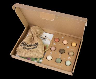 Een grote luxe geschenkdoos met 9 gekleurde Blossombs. Bewaar de Blossombs in het jute zakje en neem deze mee naar buiten om onderweg te strooien. Past door de brievenbus.