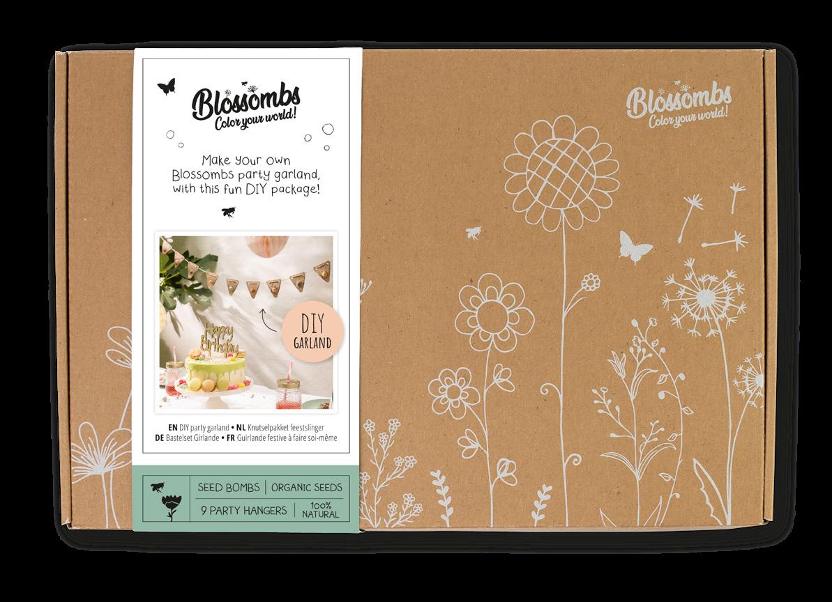Hoe leuk is het om je eigen feestslinger te maken? Een grote luxe geschenkdoos met 9 Blossombs en vlaggetjes waarmee je in een handomdraai een originele feestslinger kan knutselen. Is het feestje voorbij, dan mogen de Blossombs geplant worden en kan het feestje voor de bijen en vlinders beginnen. Bij het volgende feestje vul je ze gewoon opnieuw.