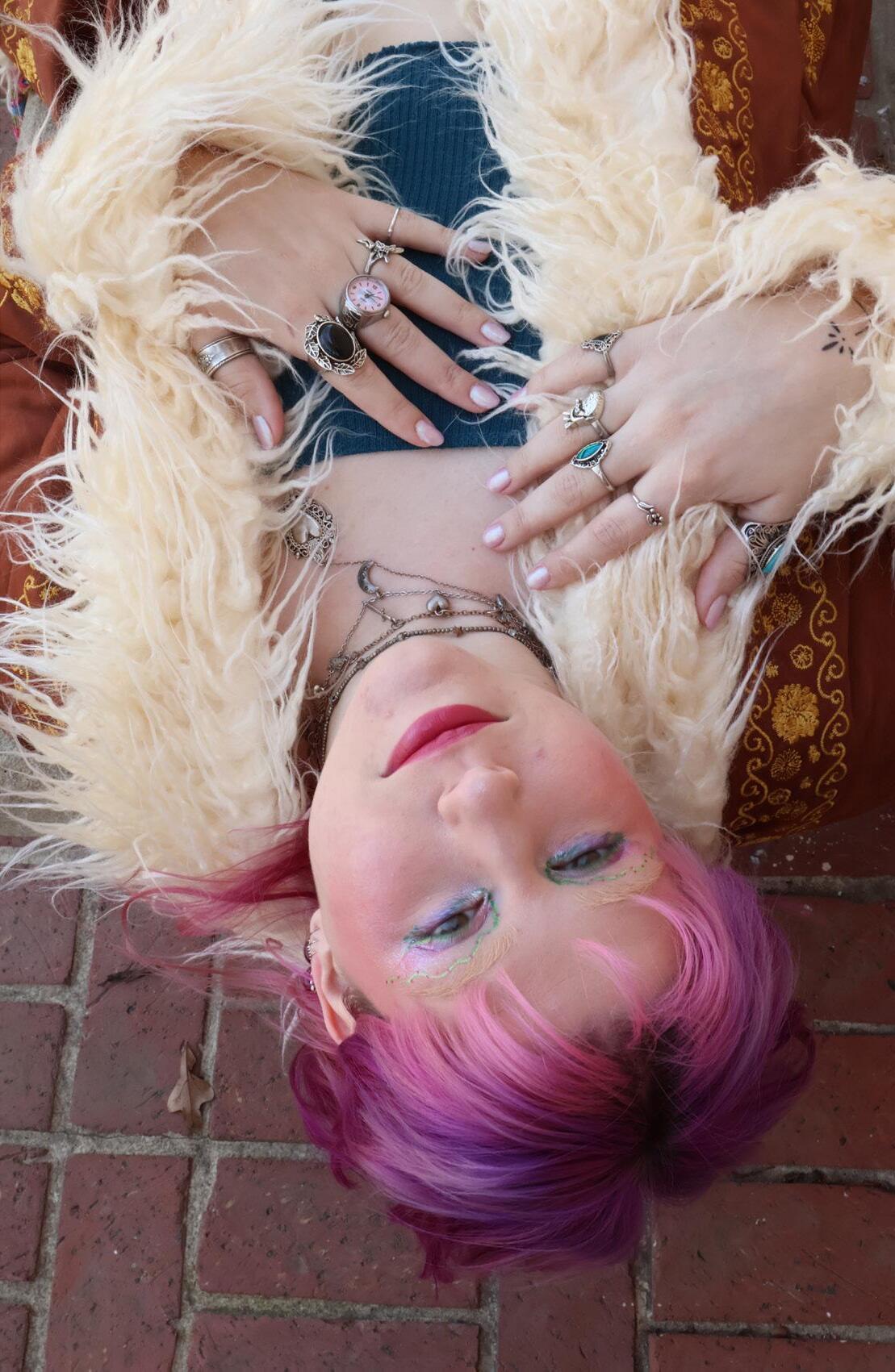 Alexiou draws inspiration from colorful beetles, butterflies, and 60s-70s fashion. To Alexiou, being creative through their style means being happy with who they are and letting all of their “weird” parts shine. Having fun is the most important thing to Alexiou, they don’t let other
