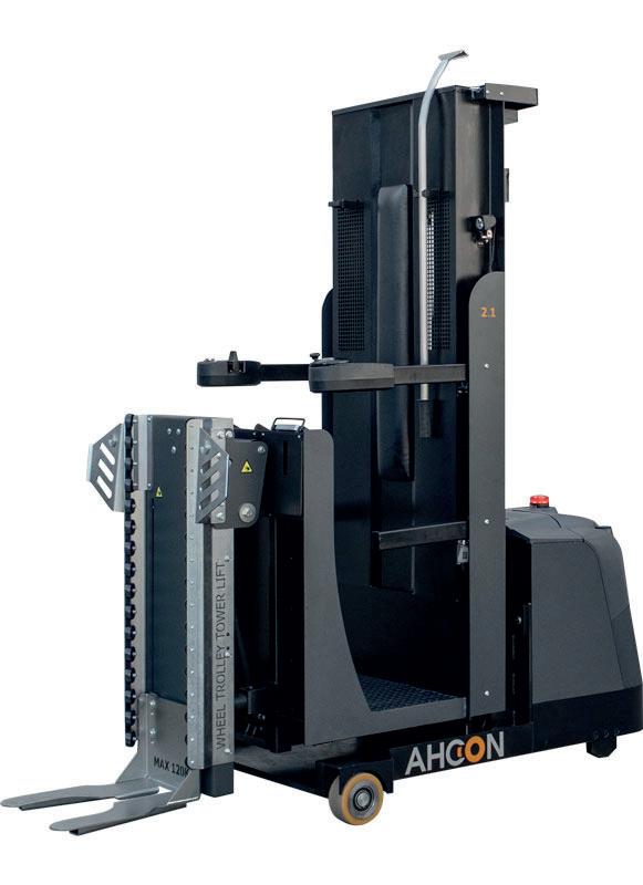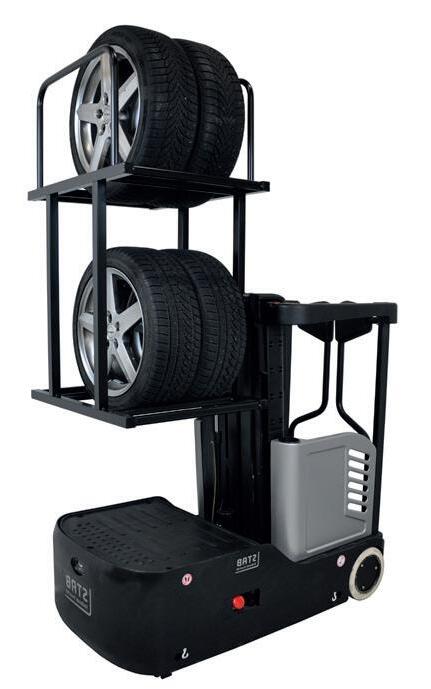 Wheel Trolley Tower Lift är en kompakt och platsbesparande truck för ergonomisk korrekt och säker hantering av däck och hjul i däckställ upp till 6,0 meter höga. Den kräver endast 1,5 meter gångutrymme mellan ställagen.