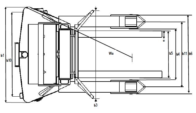 *inkl. lastskyddshöjd **Gångbreddsbehov inkl. 200 mm säkerhetsavstånd med gaffeldimension l (hjul Ø650 mm) och 90° stapling med gafflarna i transportläge (nedsänkt läge). OBS! gångbreddsbehov enl. standard SS-EN15620. Gångbredd, hantering exkl. säkerhetsavstånd rekommenderas ej. Notera med tillbehör, annan gaffellängd och skyddstak förändras gångbreddsbehovet.