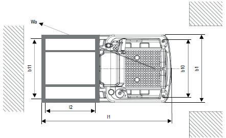 *Gångbreddsbehov inkl. 200 mm säkerhetsavstånd med gaffeldimension l (hjul Ø650 mm) och 90° stapling med gafflarna i transportläge (nedsänkt läge). OBS! gångbreddsbehov enl. standard SS-EN15620. Gångbredd, hantering exkl. säkerhetsavstånd rekommenderas ej. ! Med tillbehör, annan gaffellängd och skyddstak förändras gångbreddsbehovet.