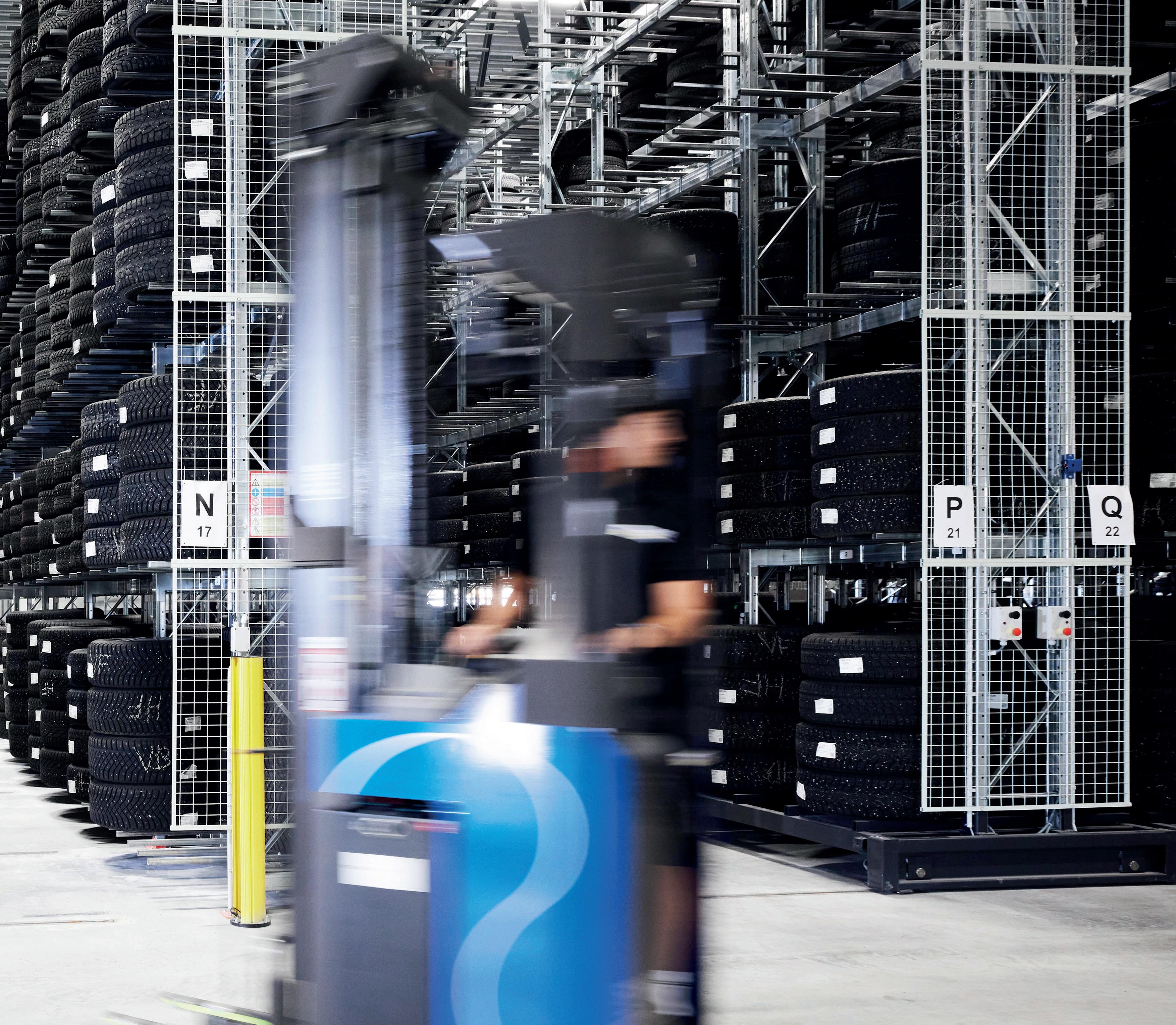 Plocktruck för stående däcklagring i stationära eller mobila däckställ eller däckmagasin. Inbyggd laddare.