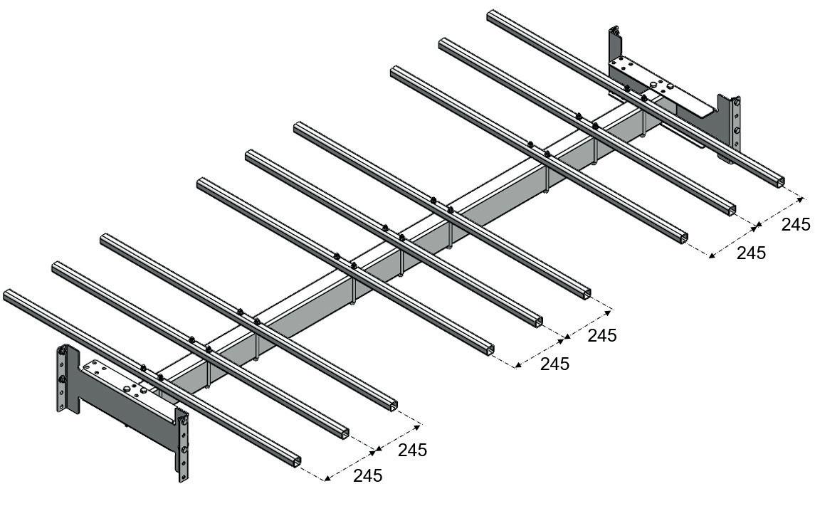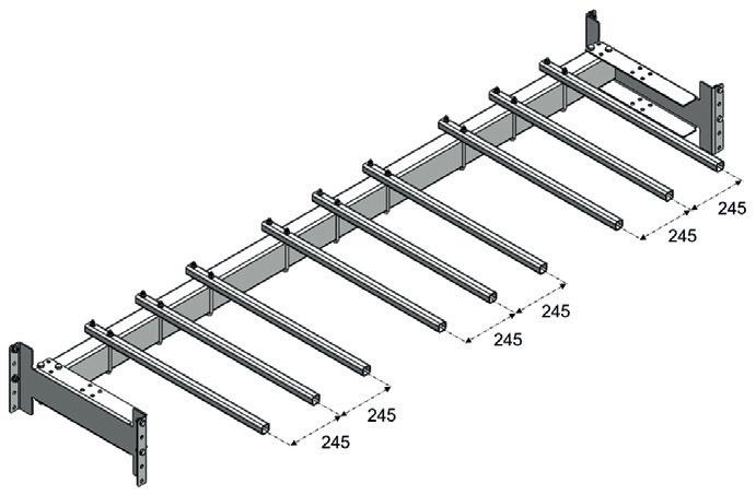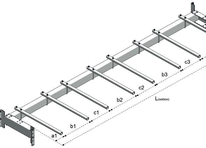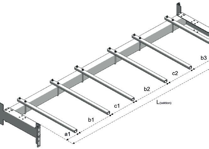 Tabeller och figurer visar rekommenderad placering av samt avstånd mellan däckhållare, längs med däckbalken. Samma placeringar och mått gäller för enkel och dubbel-ställage. Figurerna illustrerar en däckbalk för enkelställ. Sektionslängd