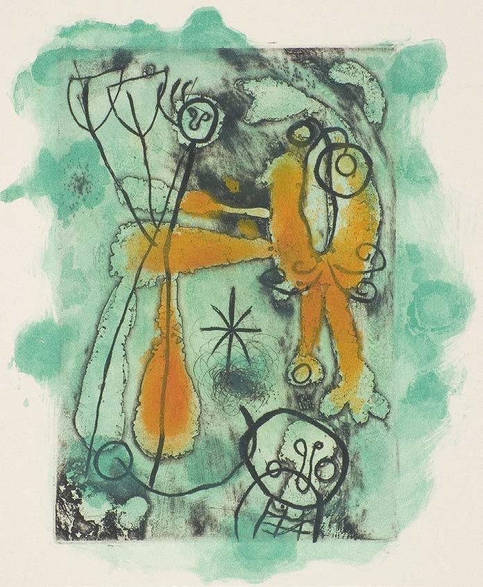 The plates for Parleur Sol (1948—50), poems written by Tzara at the time of his mental illness, are an earlier and moving work, in which Miró appears almost able to “draw” his friend’s sufferings.