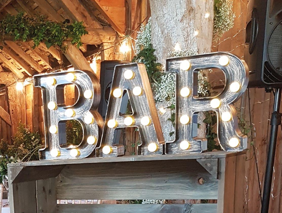 Barn décor and lighting, table and chairs, oak barrel bar and fire pit