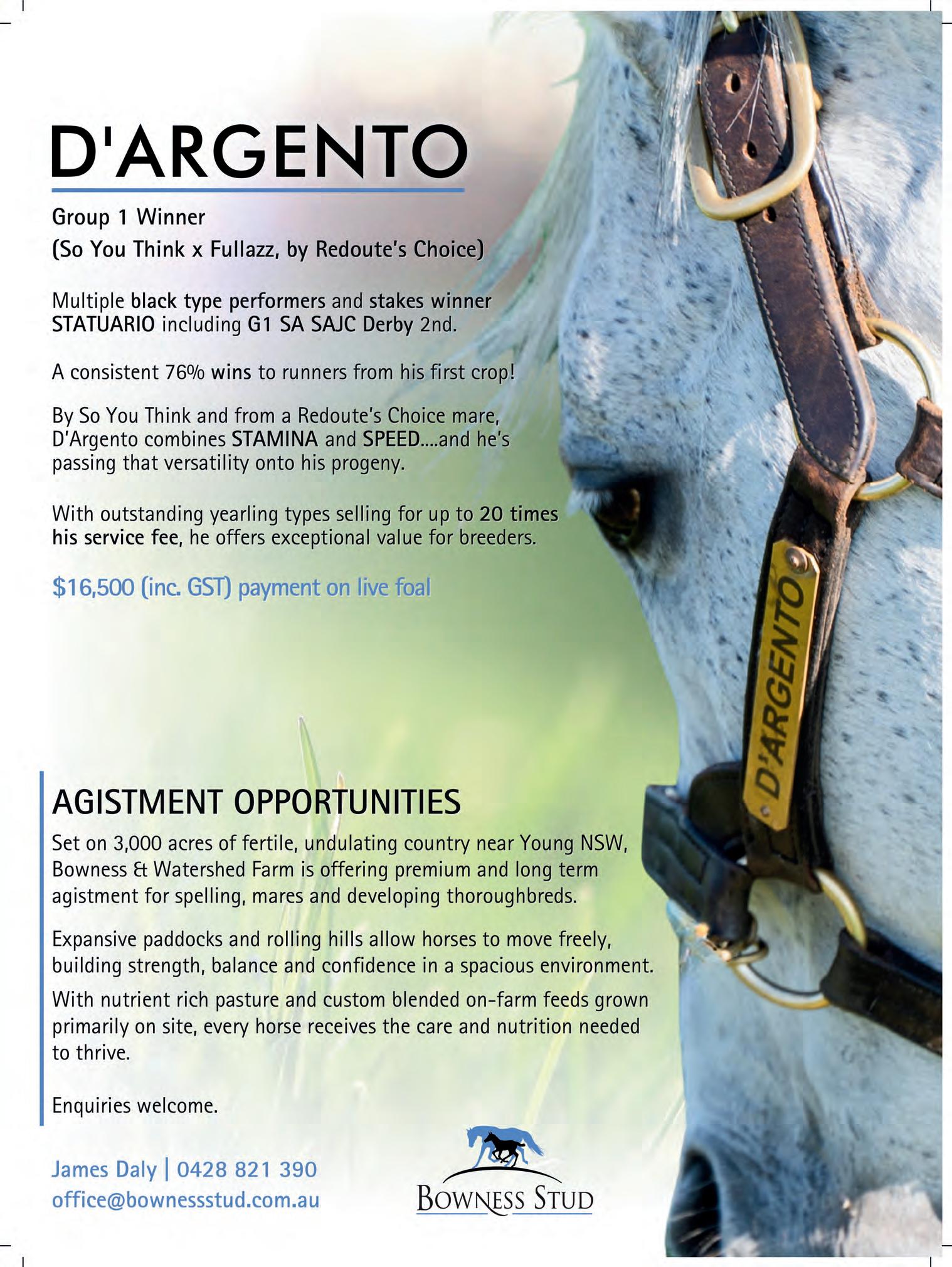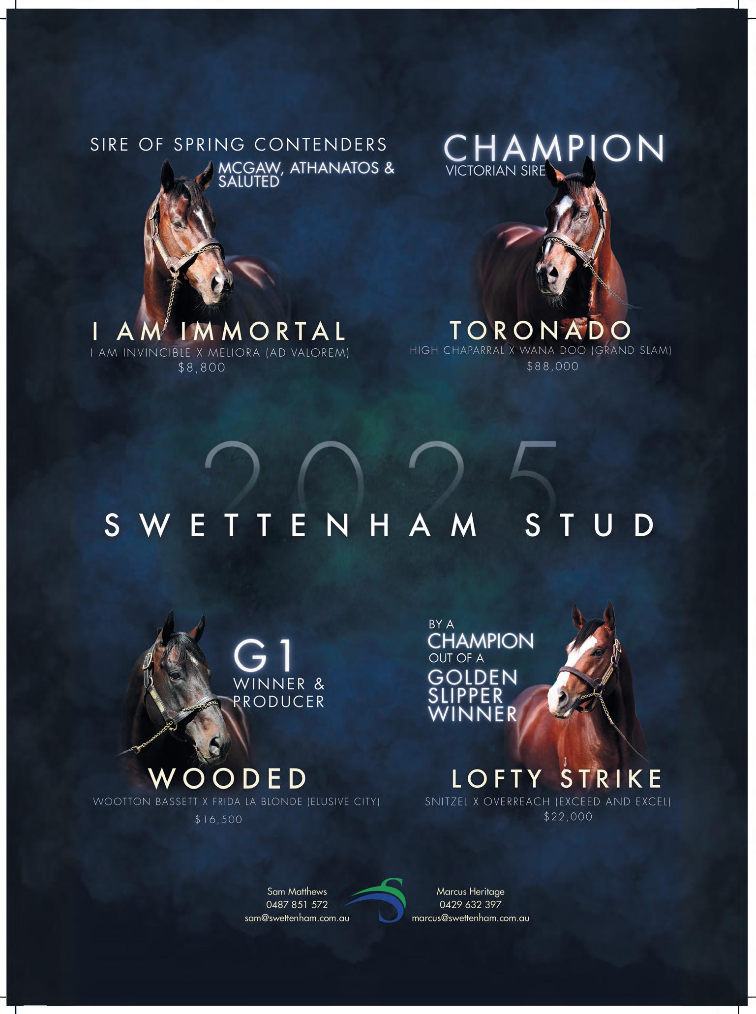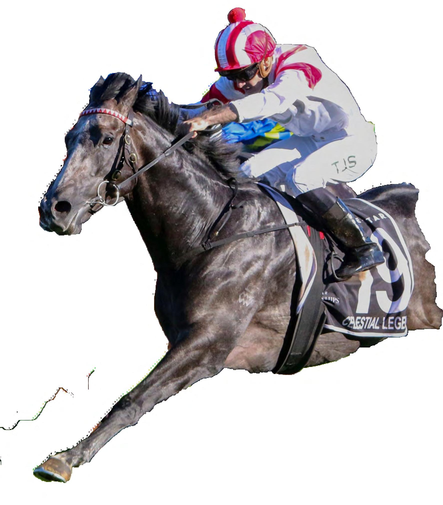 FRONT COVER: Dual Gr1 winner Celestial Legend stands his first season at Woodside Park in Victoria for the 2025 season. Celestial Legend ( Dundeel - Sarraqa by Snitzel ) won as a 2yo and following victory in the time-honoured Hobartville S he won two of Australia’s most prestigious Gr1 races, the ATC Randwick Guineas 1600m, and while still a 3yo the ATC Doncaster Handicap taking his record to 4 wins for earnings of over $3.46 million. Winning at 1200m, 1400m and 1600m, Celestial Legend displayed a rare combination of brilliance and toughness that makes him an exciting sire prospect. He is by emerging sire of sires Dundeel whose two young sons at stud Super Seth and Castelvecchio are both multiple Gr1 producing sires. His dam is by multiple champion sire Snitzel and his grandam was the Champion Older Female Sprinter in Britain. Master trainer, the ever conservative Les Bridge, conditioner of Golden Slipper winner Sir Dapper, Melbourne cup winner Kensei and spectacular The Everest winner Classique Legend, declared Celestial Legend to be the best horse he has ever trained. Standing at 16 HH, the striking grey Celestial Legend has impressed all who have seen him and stands for a first season fee of $27,500 including gst.