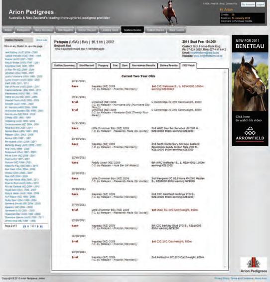 • 2YO Watch – Lists the Stallion’s current 2YO’s performances including trial and race Results and all upcoming 2YO Acceptances