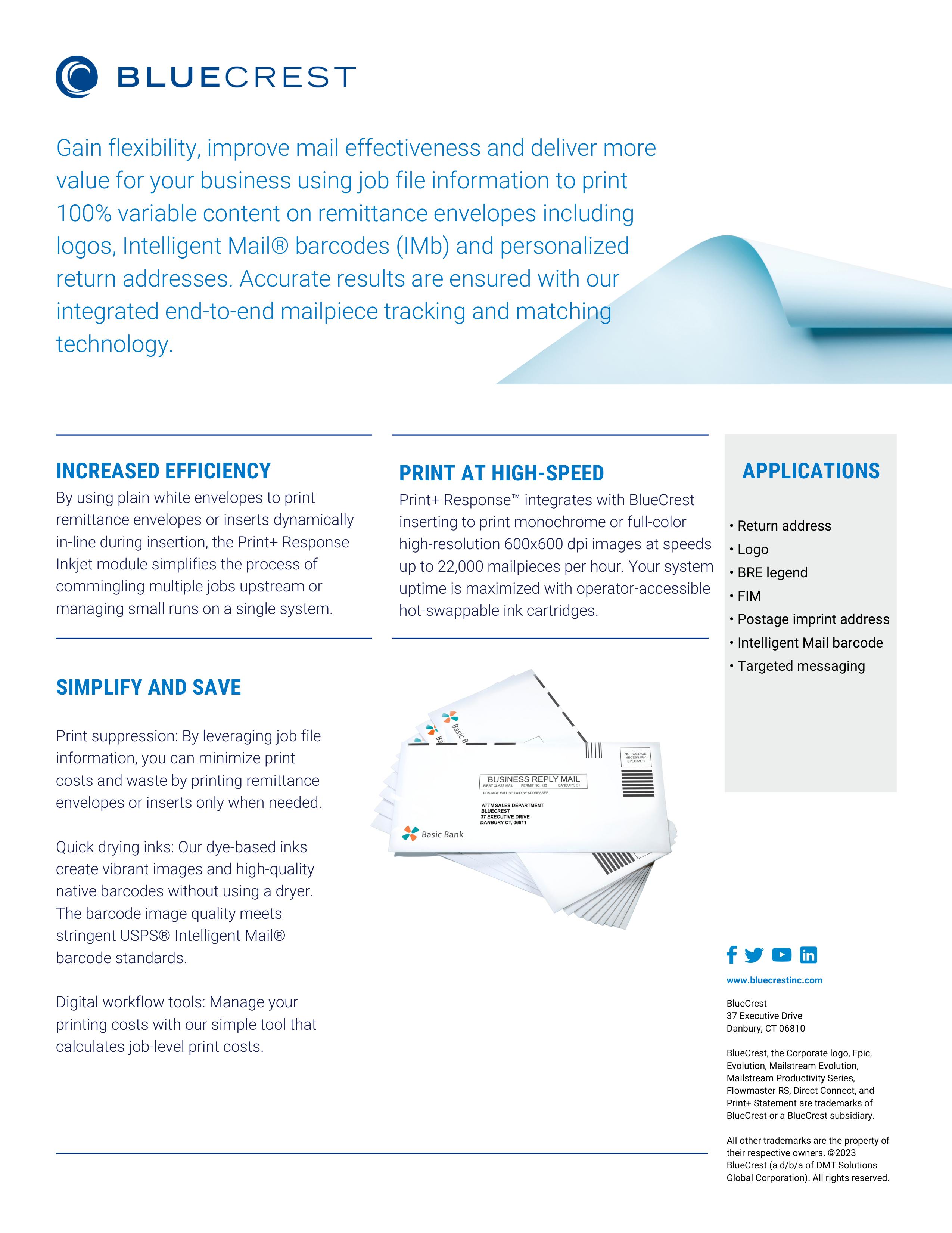 By using plain white envelopes to print remittance envelopes or inserts dynamically in-line during insertion, the Print+ Response Inkjet module simplifies the process of commingling multiple jobs upstream or managing small