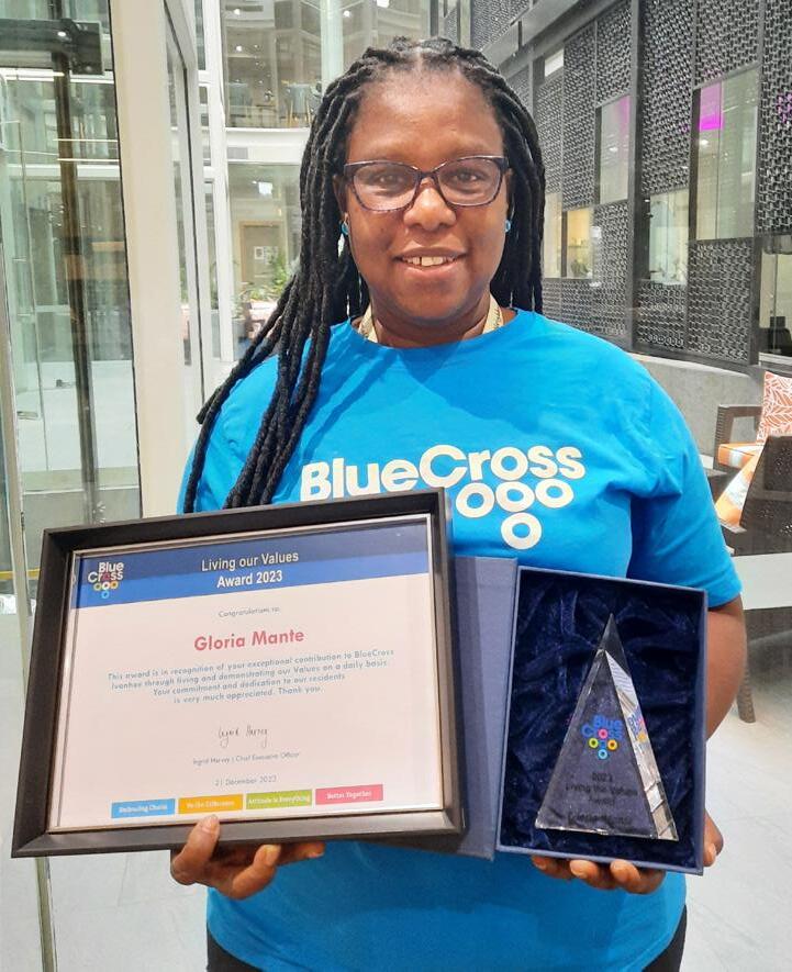 Gloria Mante of BlueCross Ivanhoe was honoured with the 2023 Living Our Values Award for her exceptional dedication and for always bringing joy and smiles to the faces of residents.