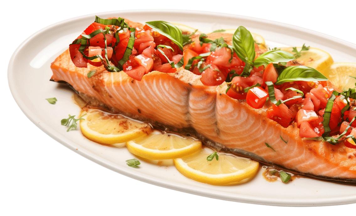 5. Serve salmon with mediterranean bruschetta topping and garnish with parsley.