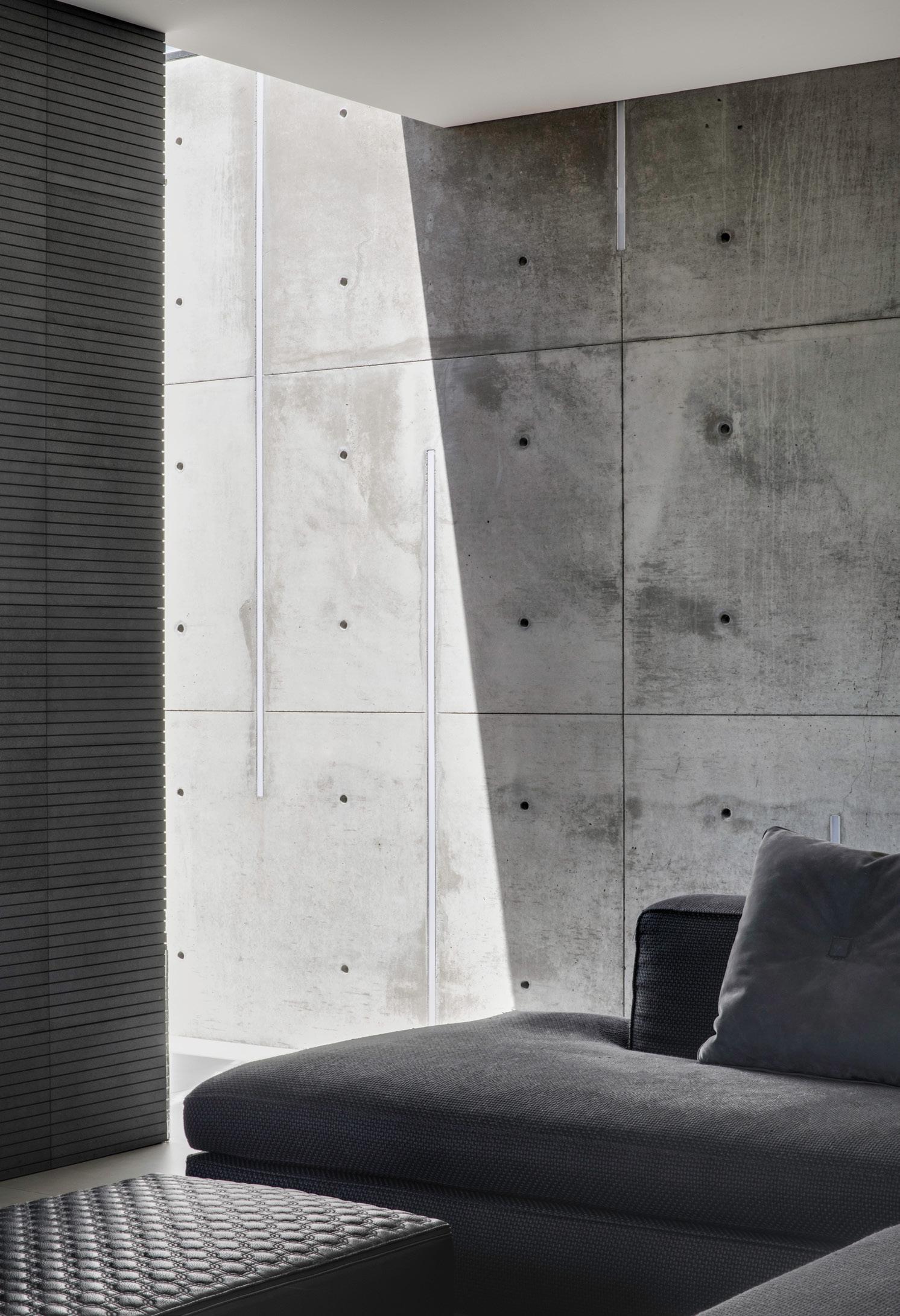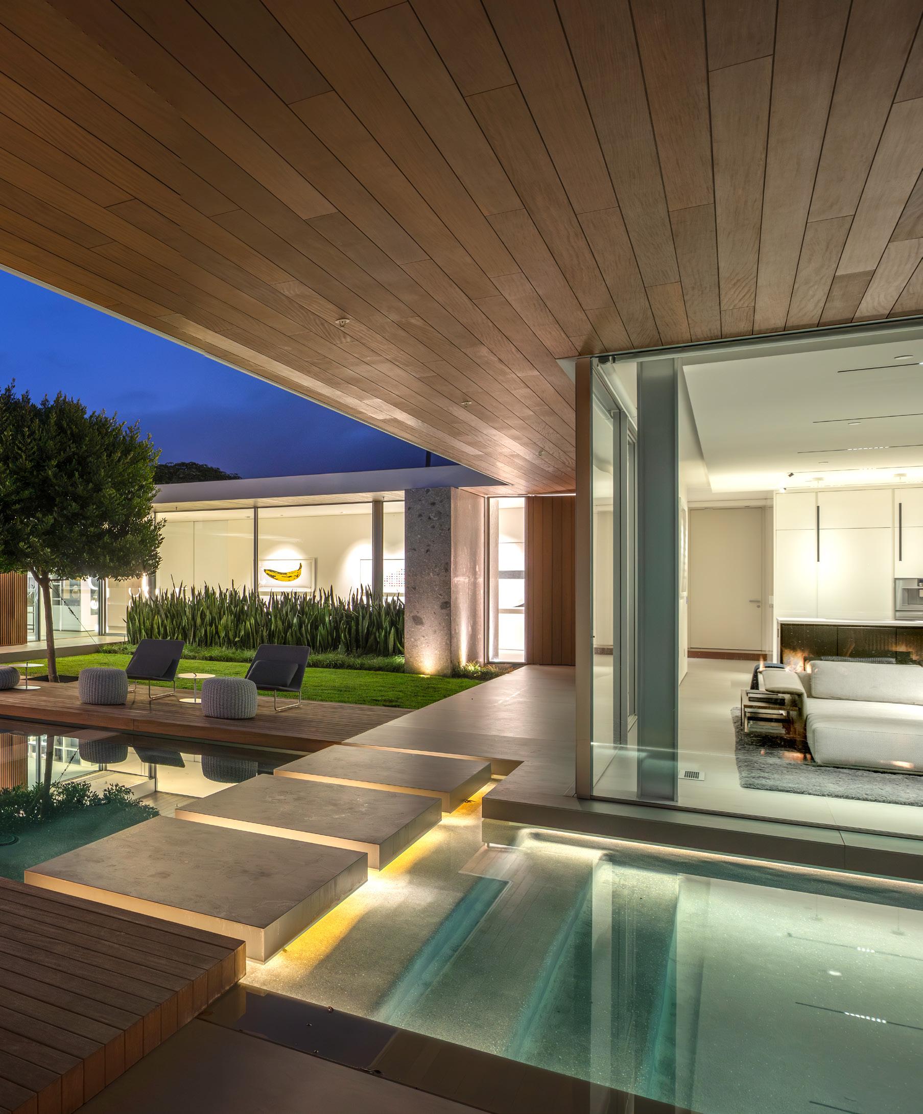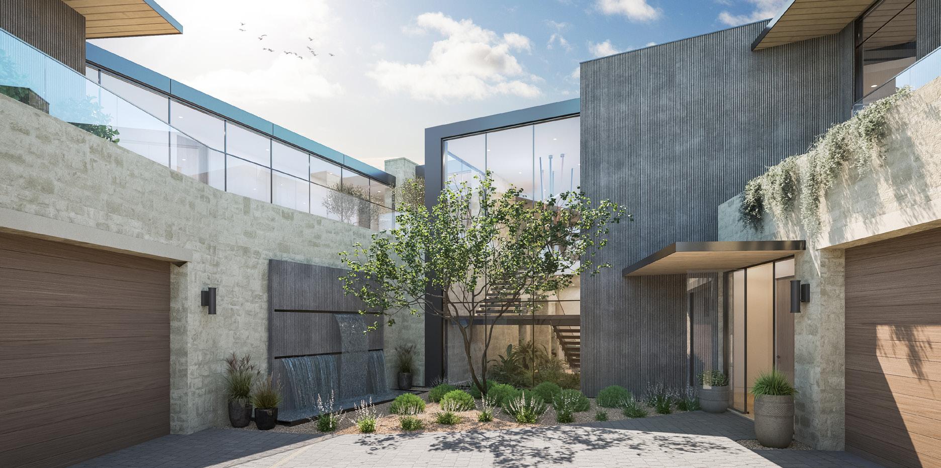 The 6,500-square-foot modernist home, completed in 2020, features three wings surrounding a large, private central courtyard adorned with luxurious olive trees and framed by a folding roof. The centerpiece of the courtyard, connecting the indoors with the outdoors, is a large linear pool projecting out to the ocean, and the estate is surrounded by the sea.