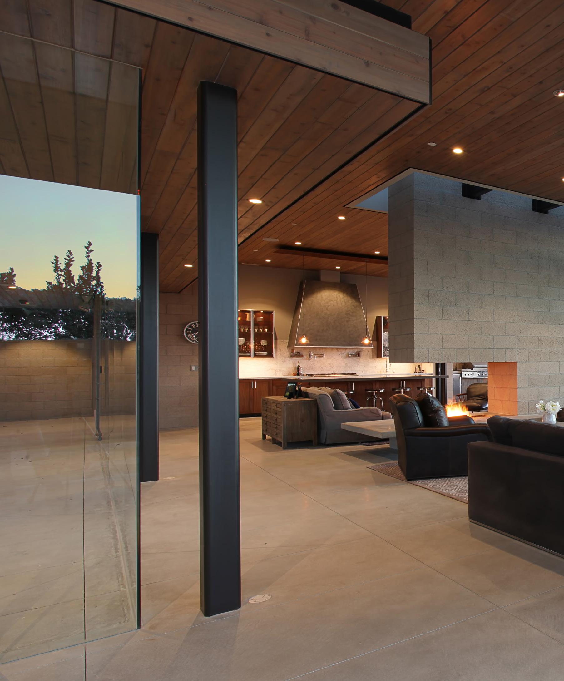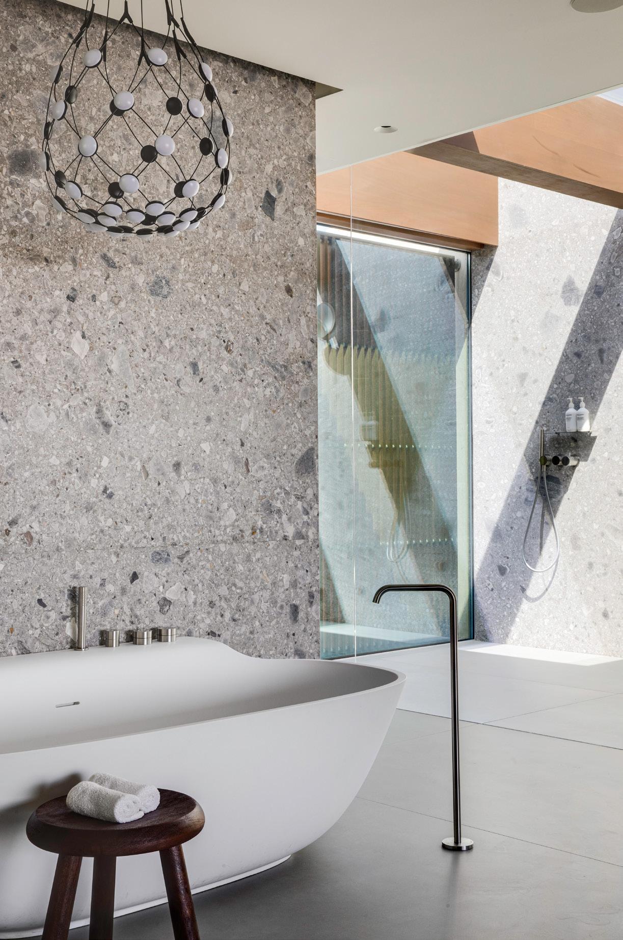 The 1,000-square-foot master suite contains a large sleeping space, a spa-like bath, and an indoor/outdoor shower. As the most intimate space in the residence, the master includes warm, tactile materials— wood, artisanal materials (exposed steel with a hand-forged tactile texture), and suede in the area rug and bed wall—conveying intimacy