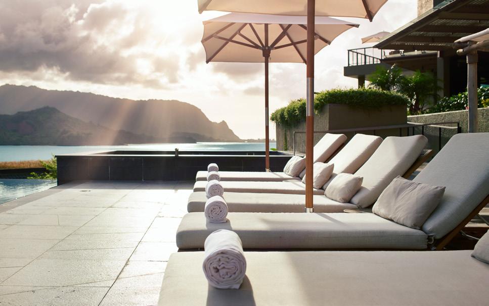 Of course, that’s not all the hotel offers for your have-the-timeof-your-life (extension) stay here. Nutrition is a key element of wellness at 1 Hotel Hanalei Bay. 1 Kitchen, the hotel’s signature restaurant, serves hyper-local, sustainably sourced breakfasts, lunches, and dinners. The bar at 1 Kitchen also features tropical-inspired handcrafted cocktails using ingredients that support local partners and distilleries that prioritize sustainable practices. Welina Terrace is an oceanfront lounge where you can order Japanese-inspired shared plates as well as Hawaiian rums, Japanese whiskeys, agave spirits, wines, and craft beers. The Sandbox is an oceanfront/poolside restaurant and bar serving lunch and cocktails (until sunset). 1 Hotel Hanalei Bay cocktail menus also offer zero and low ABV cocktails. For easy graband-go, there’s also the counter service Neighbors for coffee, breakfast, and lunch; The Juice Bar for cold-pressed juices and smoothies; the Wai’oli for cold treats (including alcohol-infused syrups and toppings) for pool or beachfront consumption. There’s also the Lobby Farmstand, with healthy snacks stocked