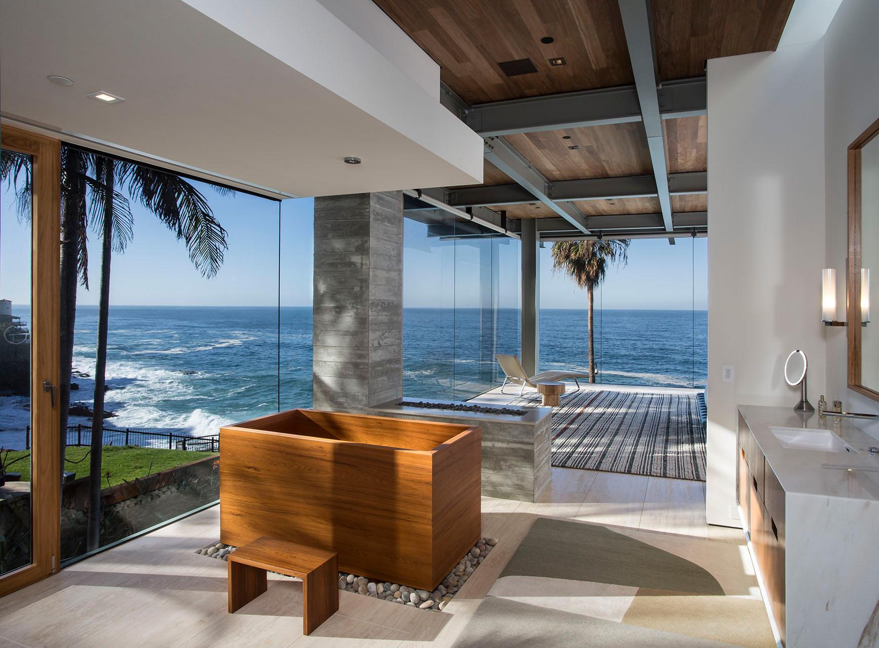 Architect Horst Noppenberger, who designed the Irvine Cove home, has been enamored with modernist architecture since embarking on his career decades ago. He describes the seaside home as directly responding to the site and climate, embracing an open floor plan, integrating the interior and exterior spaces, and offering an ambiance of permanence through materials and design features.