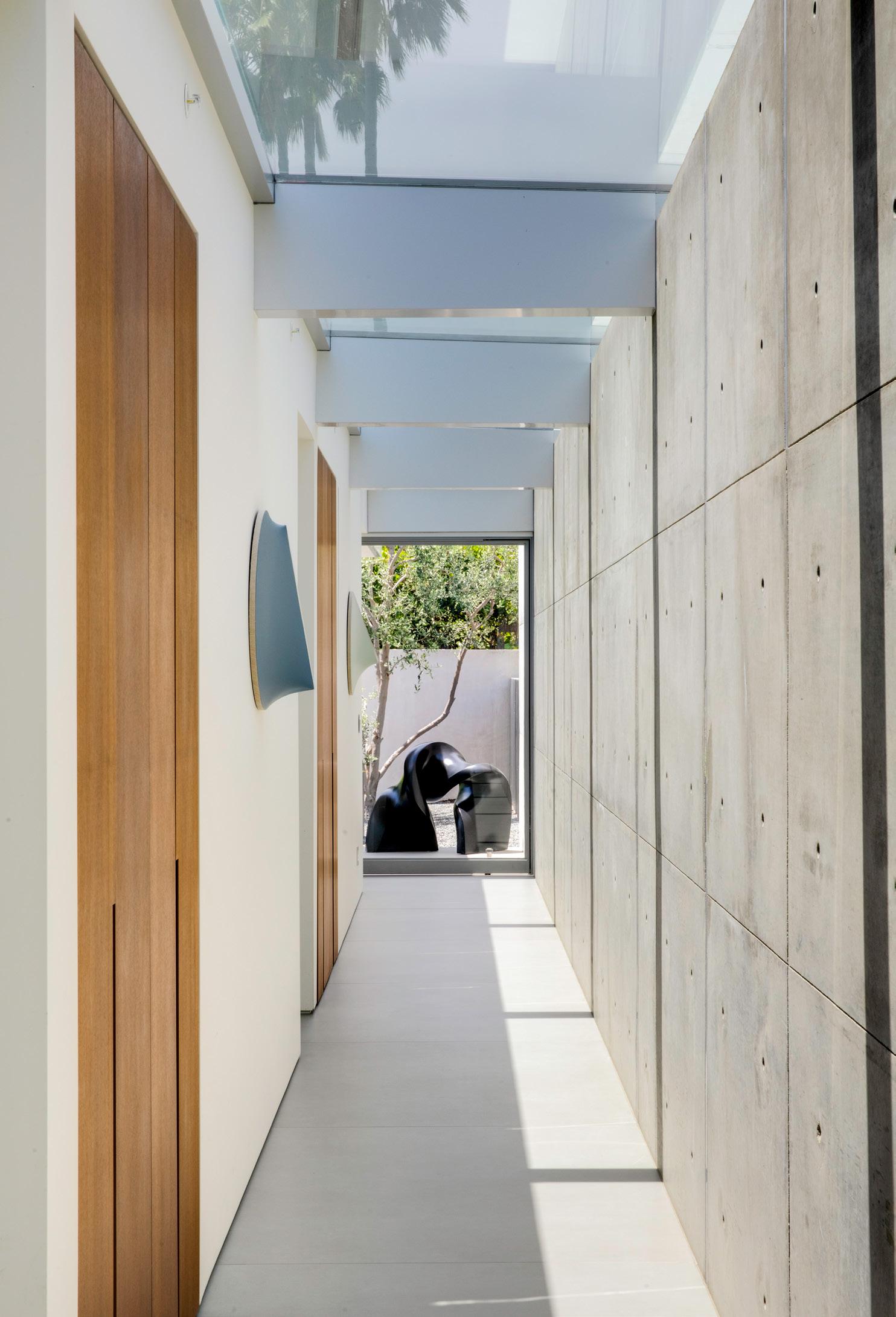 The front wing along the street contains the communal spaces: the kitchen, the studio, and the family lounge areas. The second wing contains the four guest bedrooms; the third wing is simply the master suite. All five bedrooms face the courtyard, affording ocean views through the sliding slatted wood louvers. These screens provide privacy, warmth, and intimacy while orchestrating nature and light flowing in from the outside. The four secondary bedrooms, each approximately 12 by 14 feet, have ensuite attached bathrooms and are designed with a “minimalist aesthetic.”