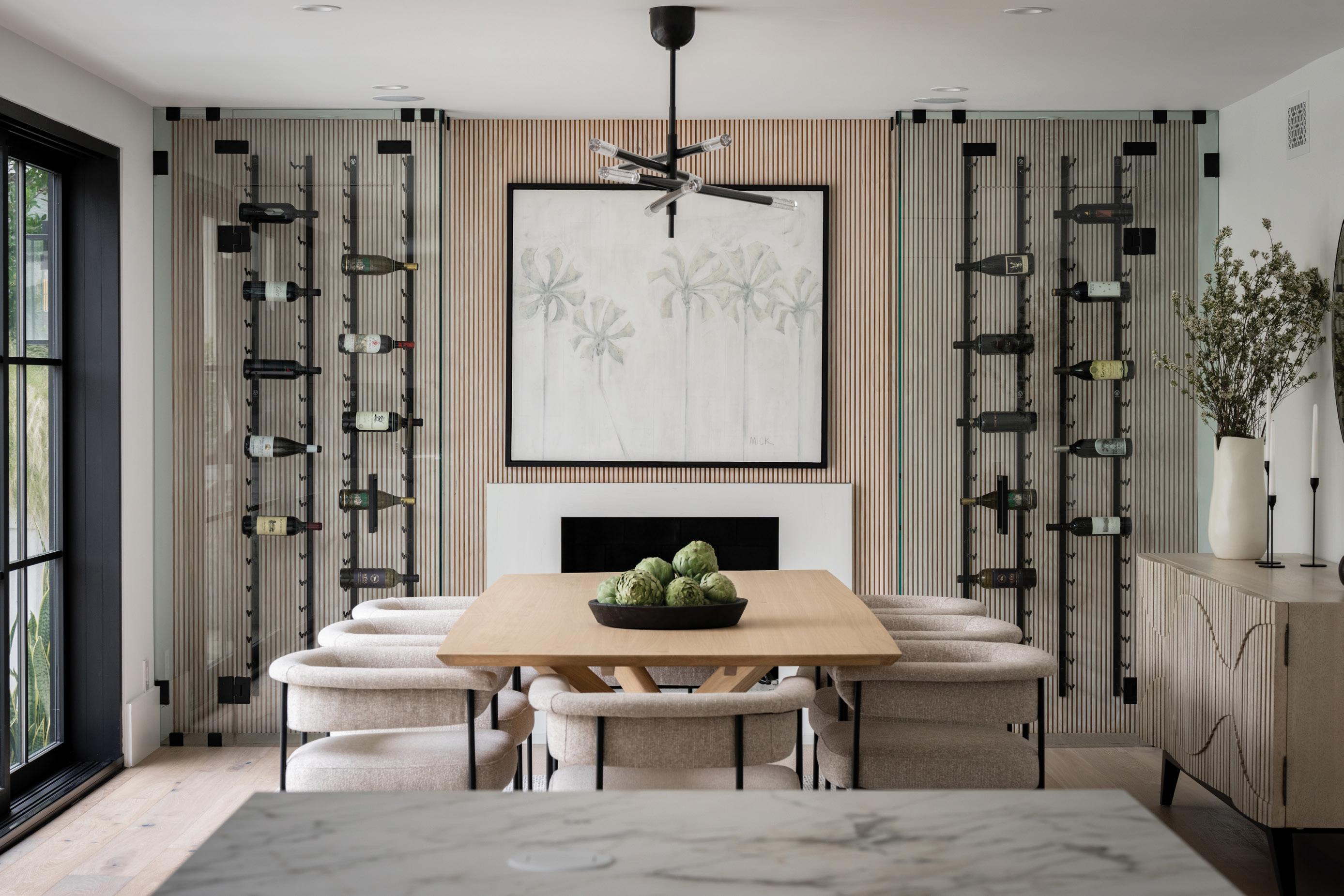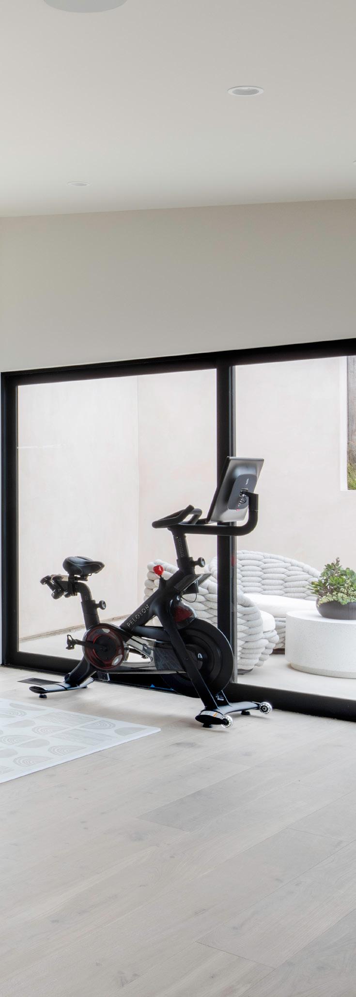The Irvine Cove home features a subterranean level accessed through graceful wooden stairs and contains an exercise room, a bar, and a lounge area. Throughout the house, two- and three-dimensional modern art, curated by local gallerist Peter Blake, reflects the residence’s minimalist design aesthetic. The art is an elegant addition to a home that is a work of art all by itself.