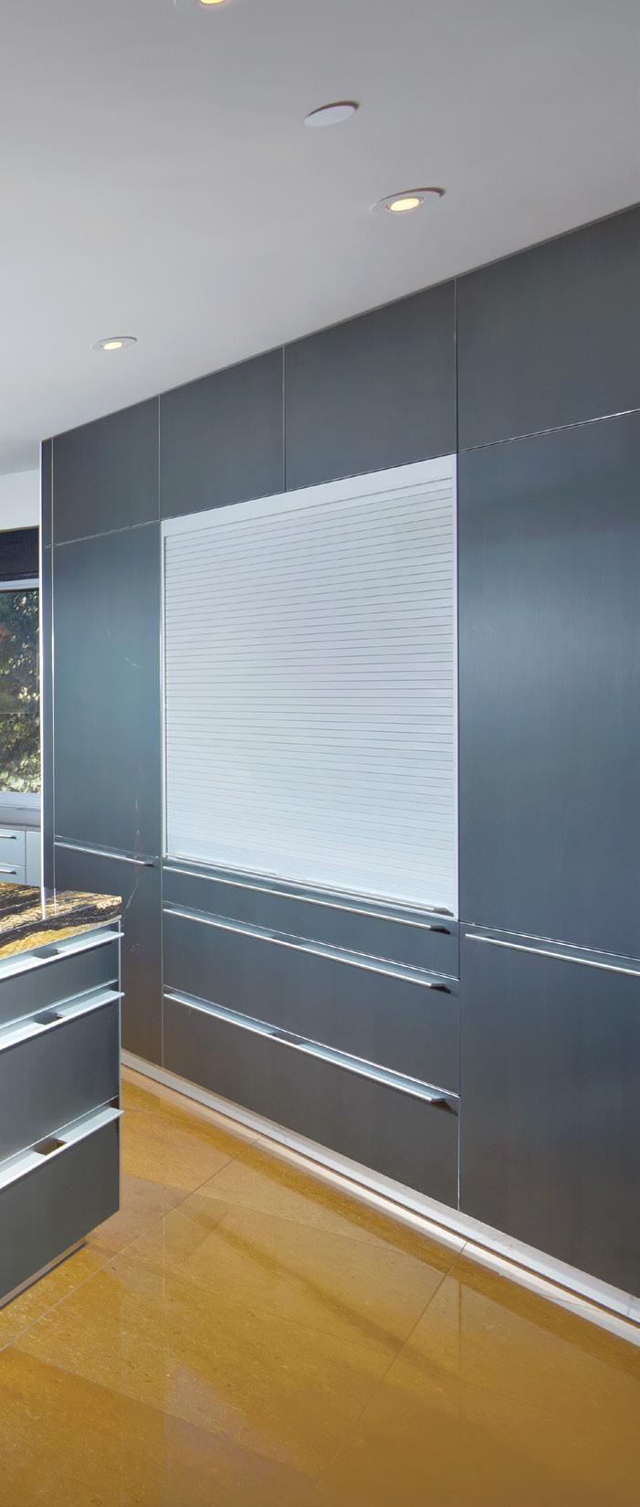 and privacy. Another welcoming aspect of the master suite is the asymmetrical lighting beside the bed, contributing to a relaxed, informal feeling. The suite also contains an inside/outside shower with a glass ceiling and perforated metal screen above the glass, creating the feeling of sunlight being filtered through tree canopies.