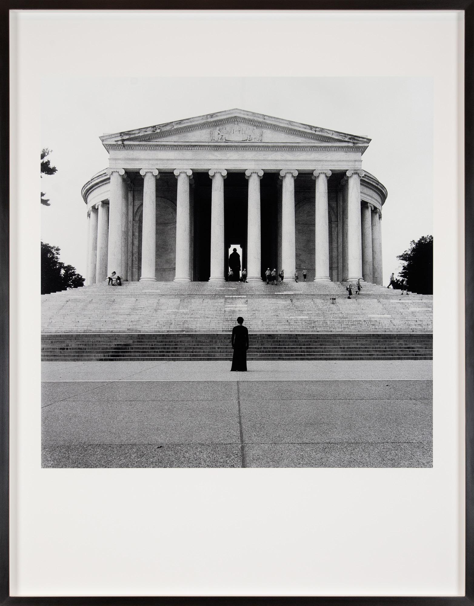 That social insight is evident in Museum Series , which shows Weems dressed in black standing with her back to the camera at muse ums and major cultural institutions. Weems has described her character as a witness who invites the viewer to consider how power is inscribed in the architecture of these spaces. Who is welcomed and represented in the museums she visits?