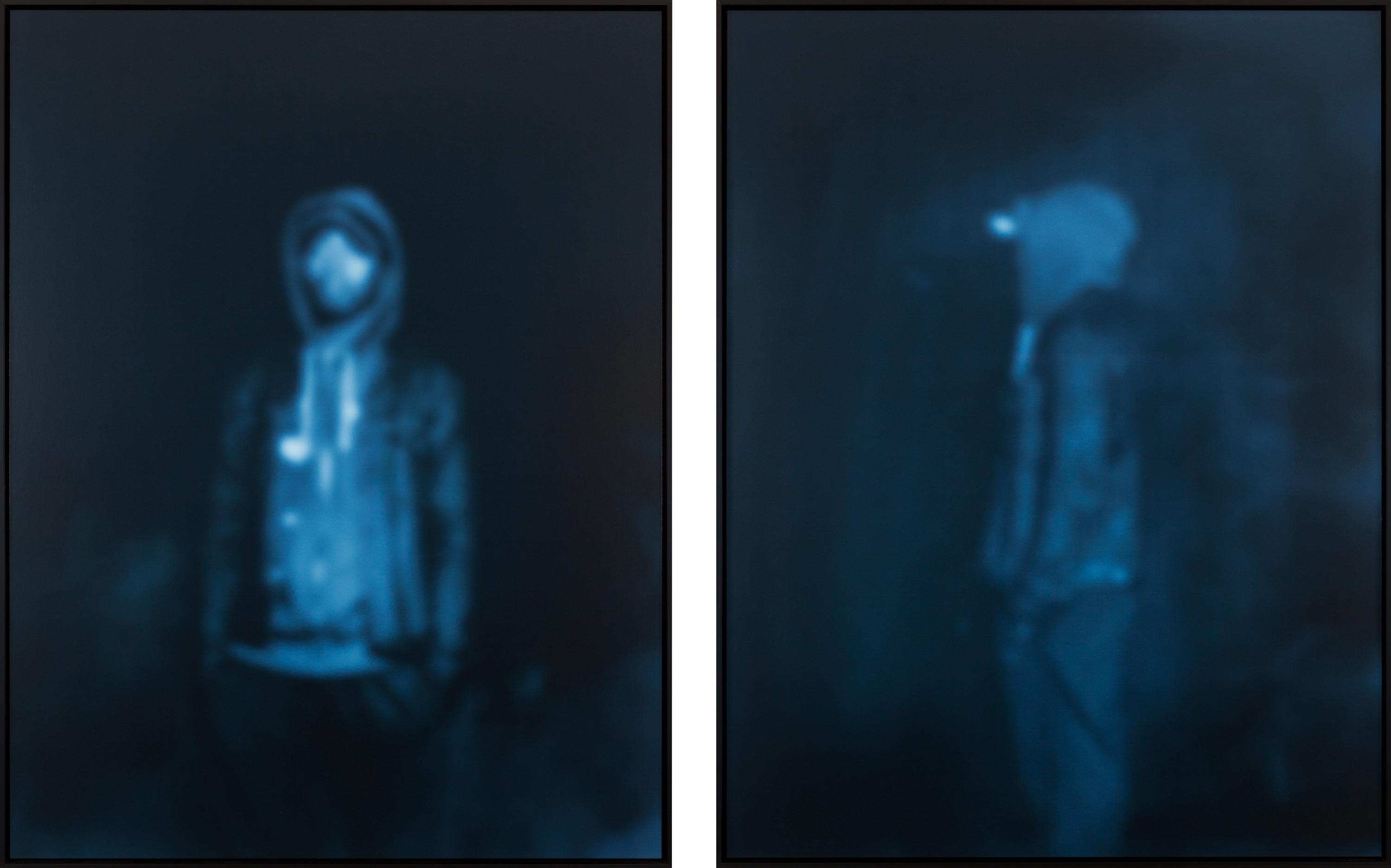In Blue Notes, the viewer sees grainy blue por traits of Black pop culture figures and artists whose faces are hidden by blocks of solid color. This concealment of identity suggests the ways in which society values Black cultural production, but often erases the influence of Black people’s cultural contributions to society.