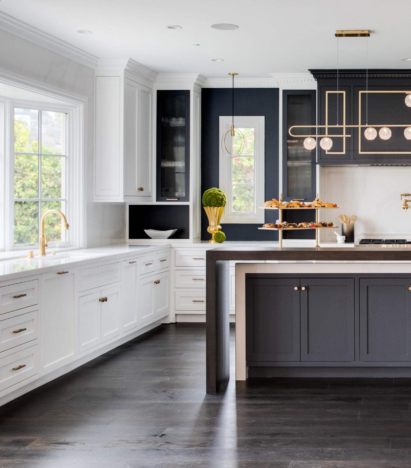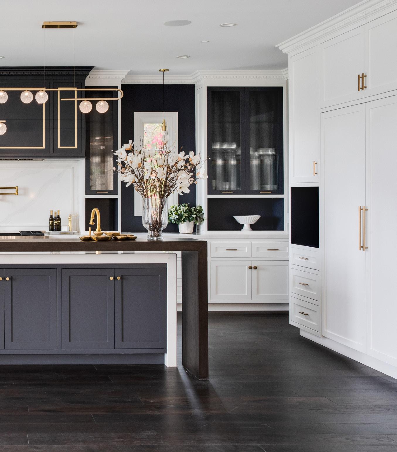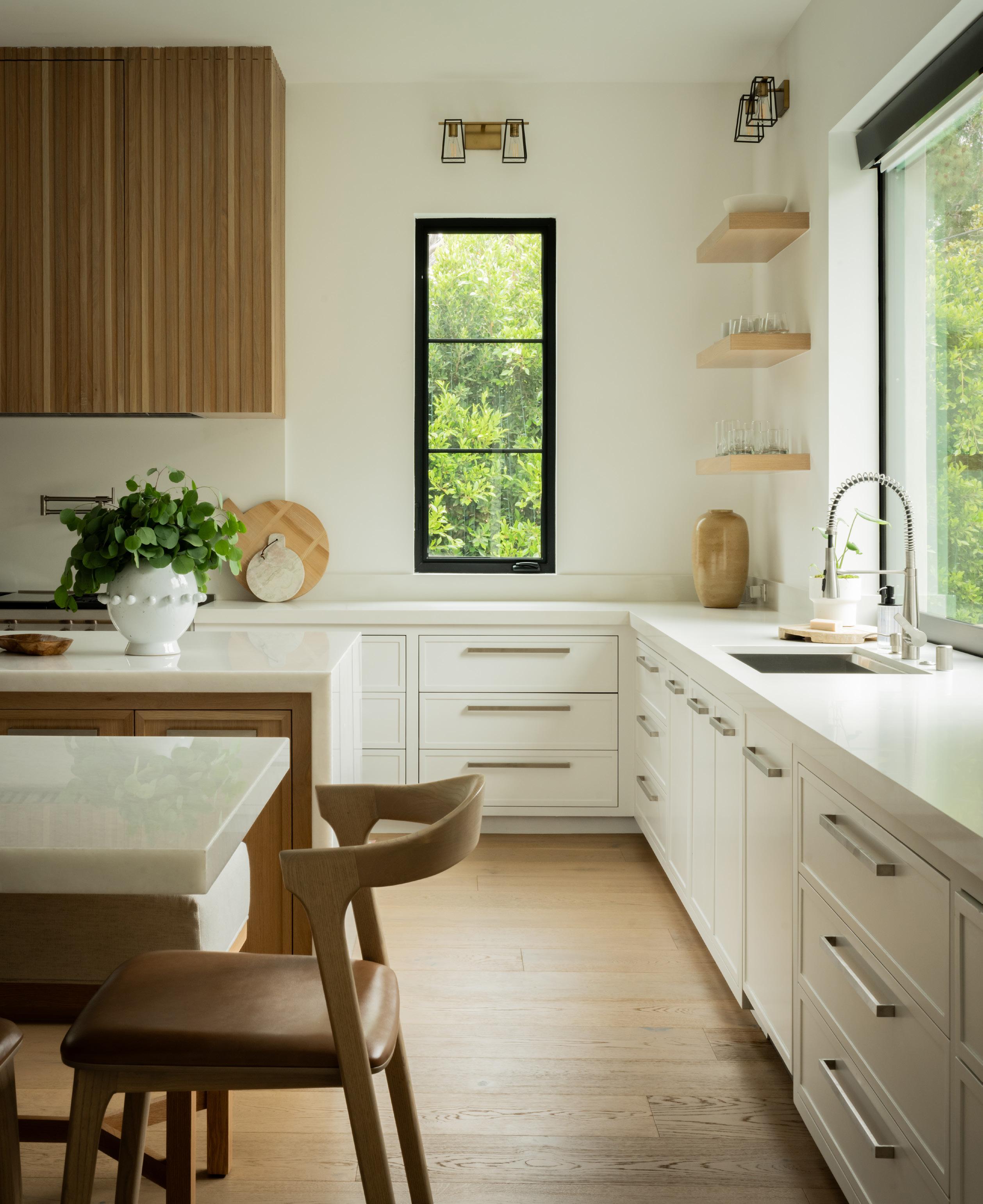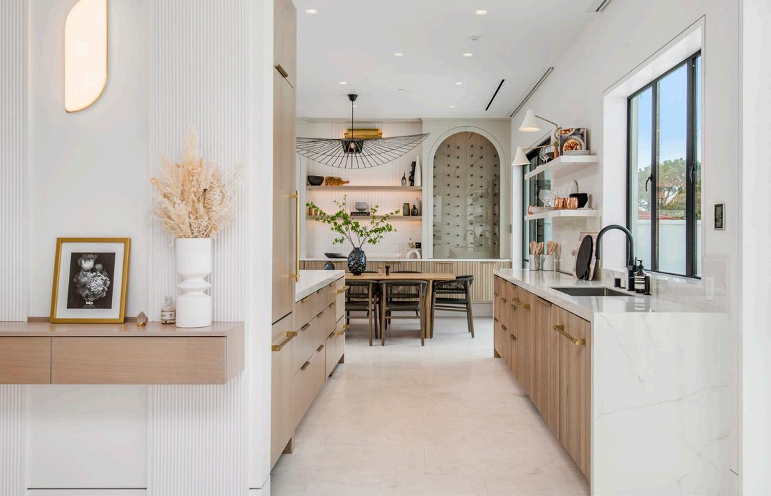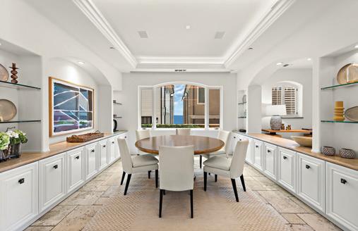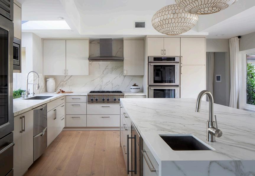 The main kitchen with a Lemurian Silver-topped waterfall edge island, custom millwork, and an invisible under-counter induction range is truly the center of this home while the secondary kitchen hidden behind pocket doors is ideal for everyday use. Overseen by Sarah Marie Interiors, the neutral palette design