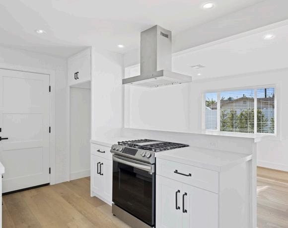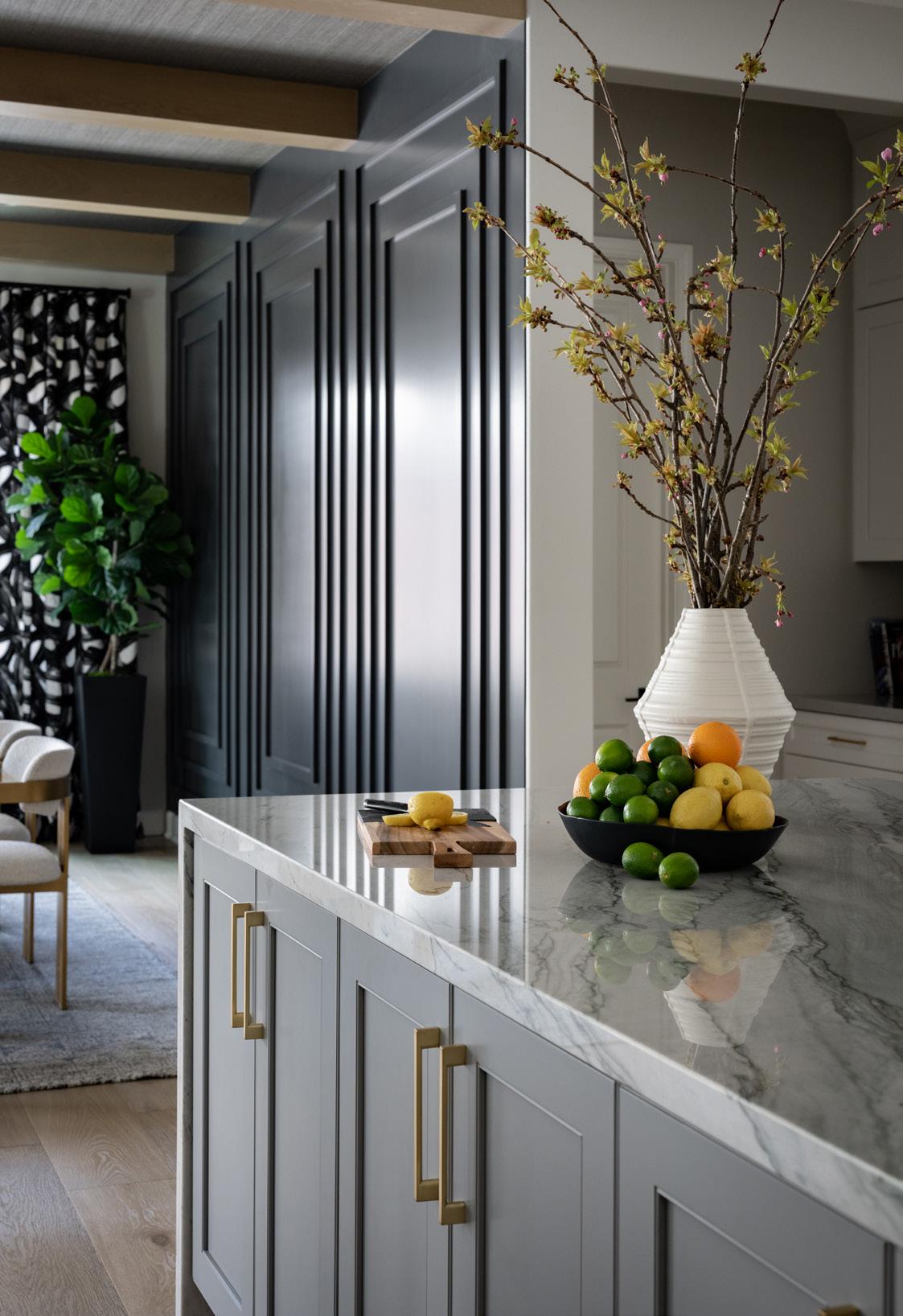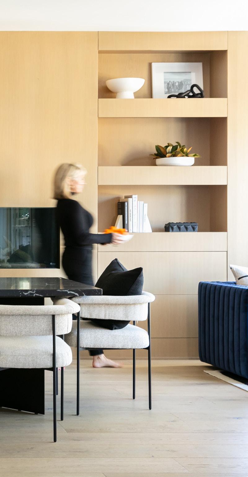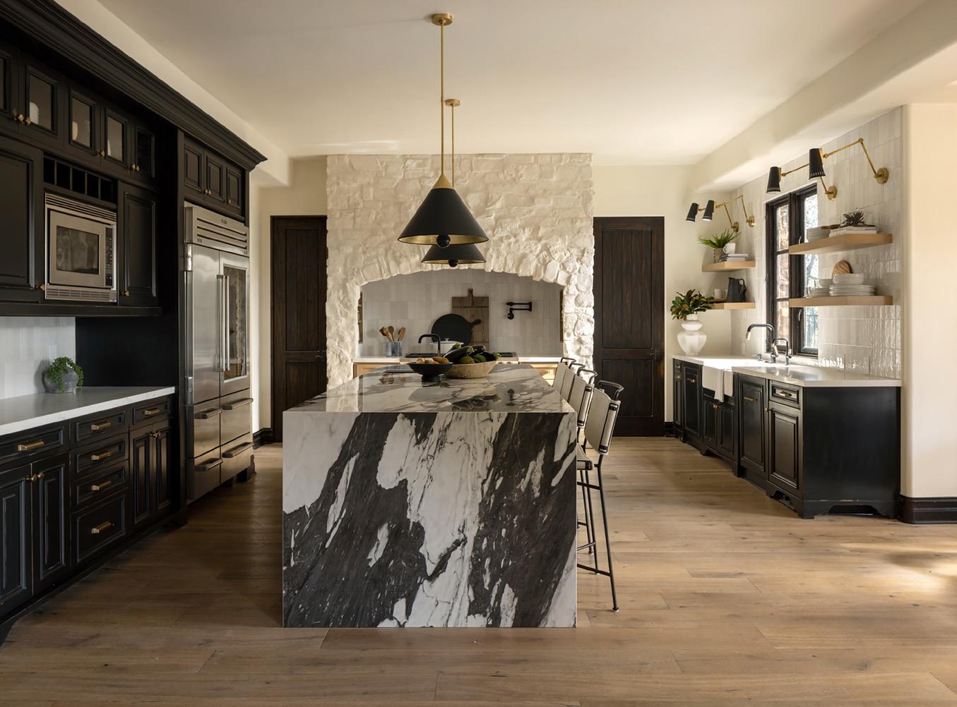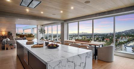 The main kitchen with a Lemurian Silver-topped waterfall edge island, custom millwork, and an invisible under-counter induction range is truly the center of this home while the secondary kitchen hidden behind pocket doors is ideal for everyday use. Overseen by Sarah Marie Interiors, the neutral palette design