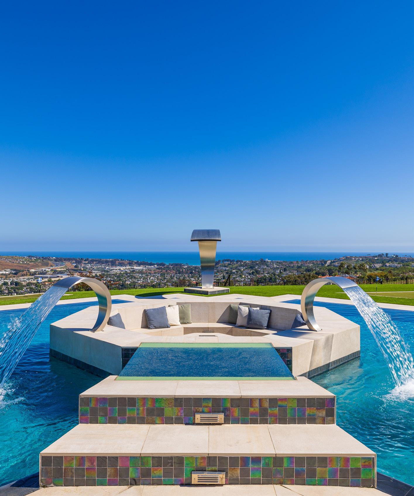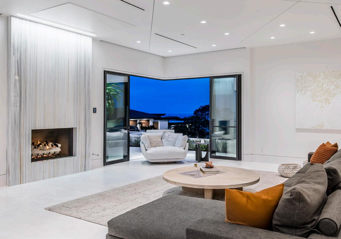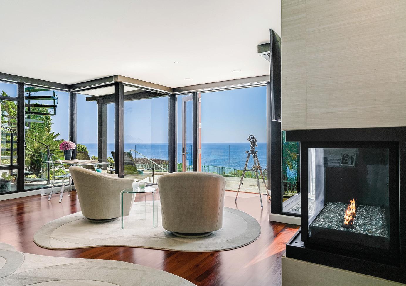 Capturing the essence of California chic, the exterior space connects seamlessly to the home’s interior with multiple sitting areas, a dramatic pool, a separate hot tub, and a fire pit. An expert in luxury coastal real estate, Stanaland wastes no time pointing out the best features of this home.