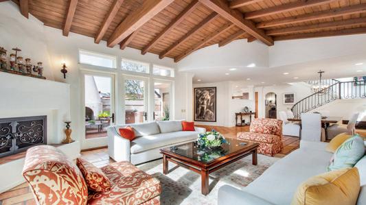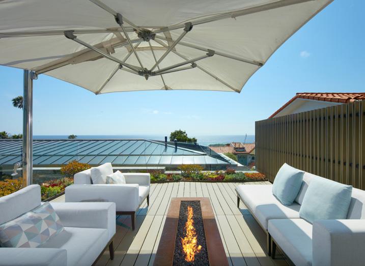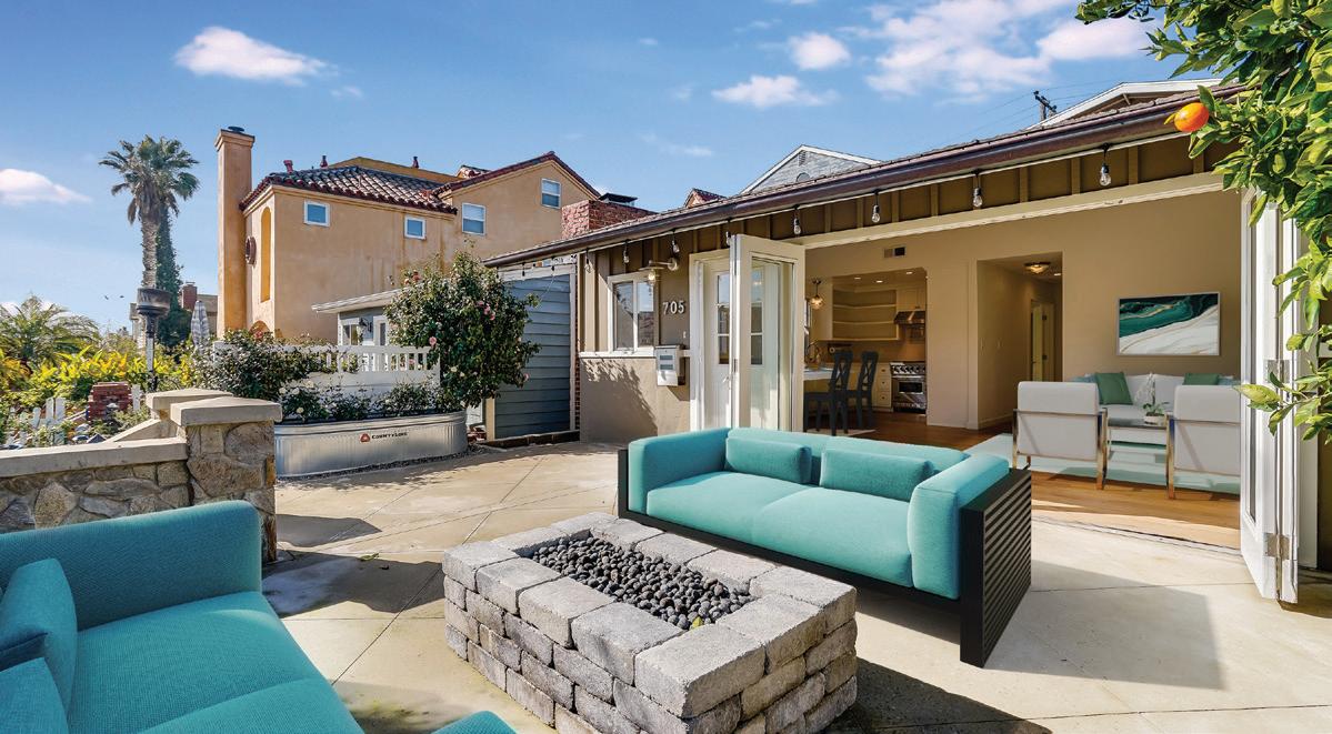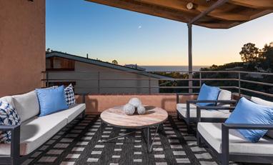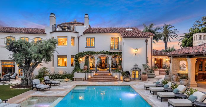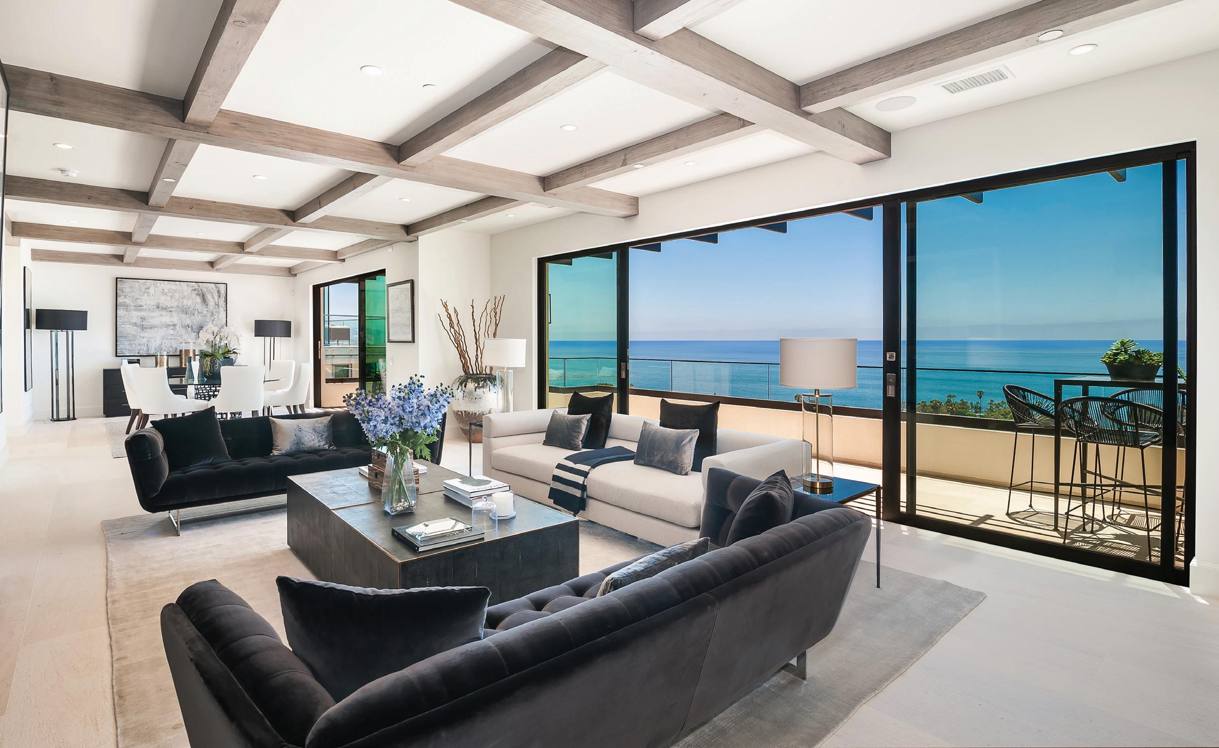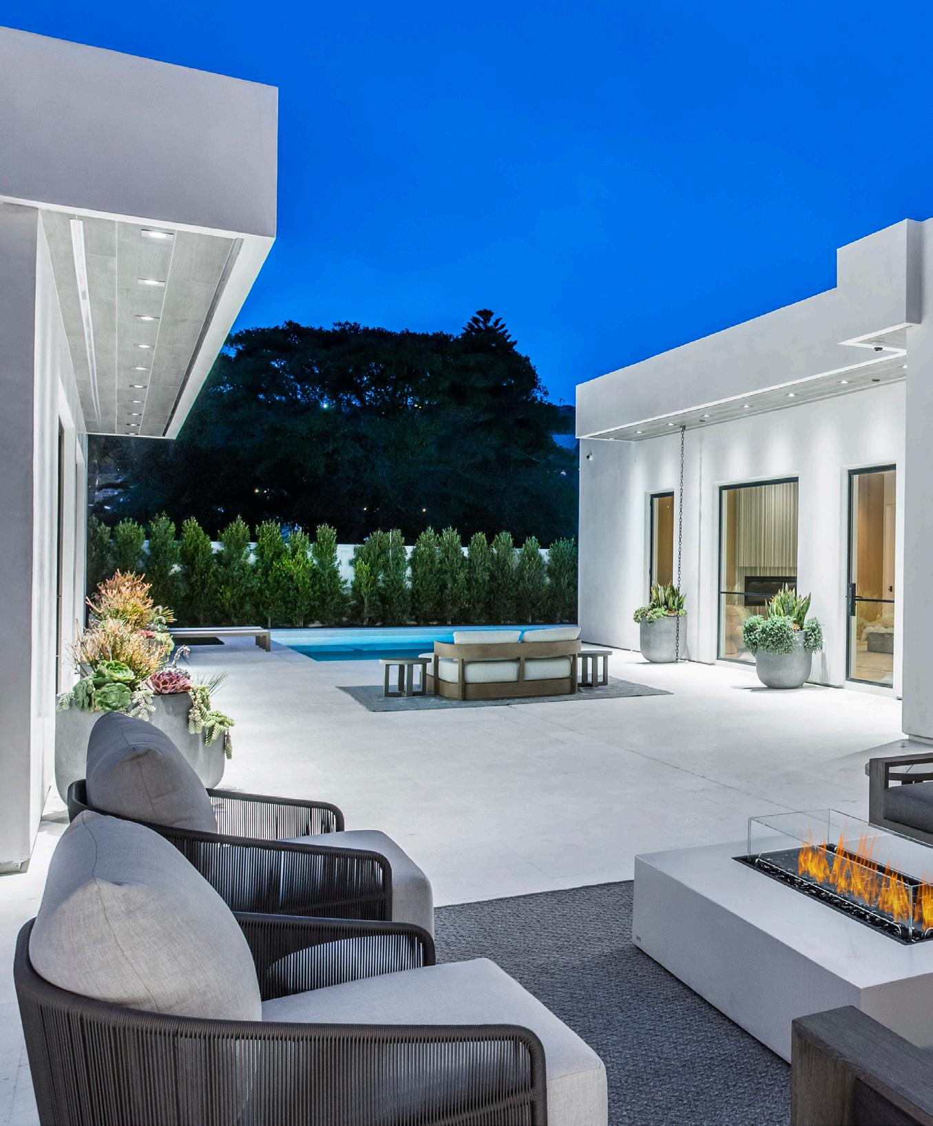 Capturing the essence of California chic, the exterior space connects seamlessly to the home’s interior with multiple sitting areas, a dramatic pool, a separate hot tub, and a fire pit. An expert in luxury coastal real estate, Stanaland wastes no time pointing out the best features of this home.
