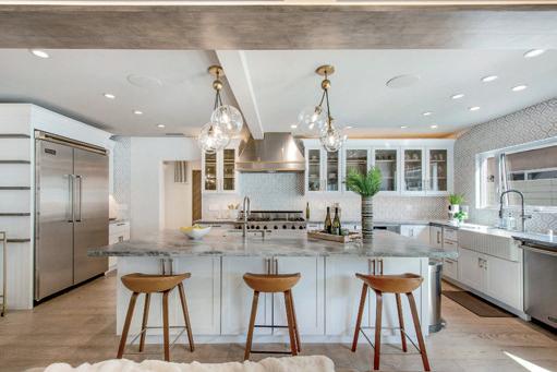 The centerpiece of the home’s ultra-private backyard is a large, sleek pool.Arches and statement-making light fixtures add a personal touch to the state-of-the-art kitchen.