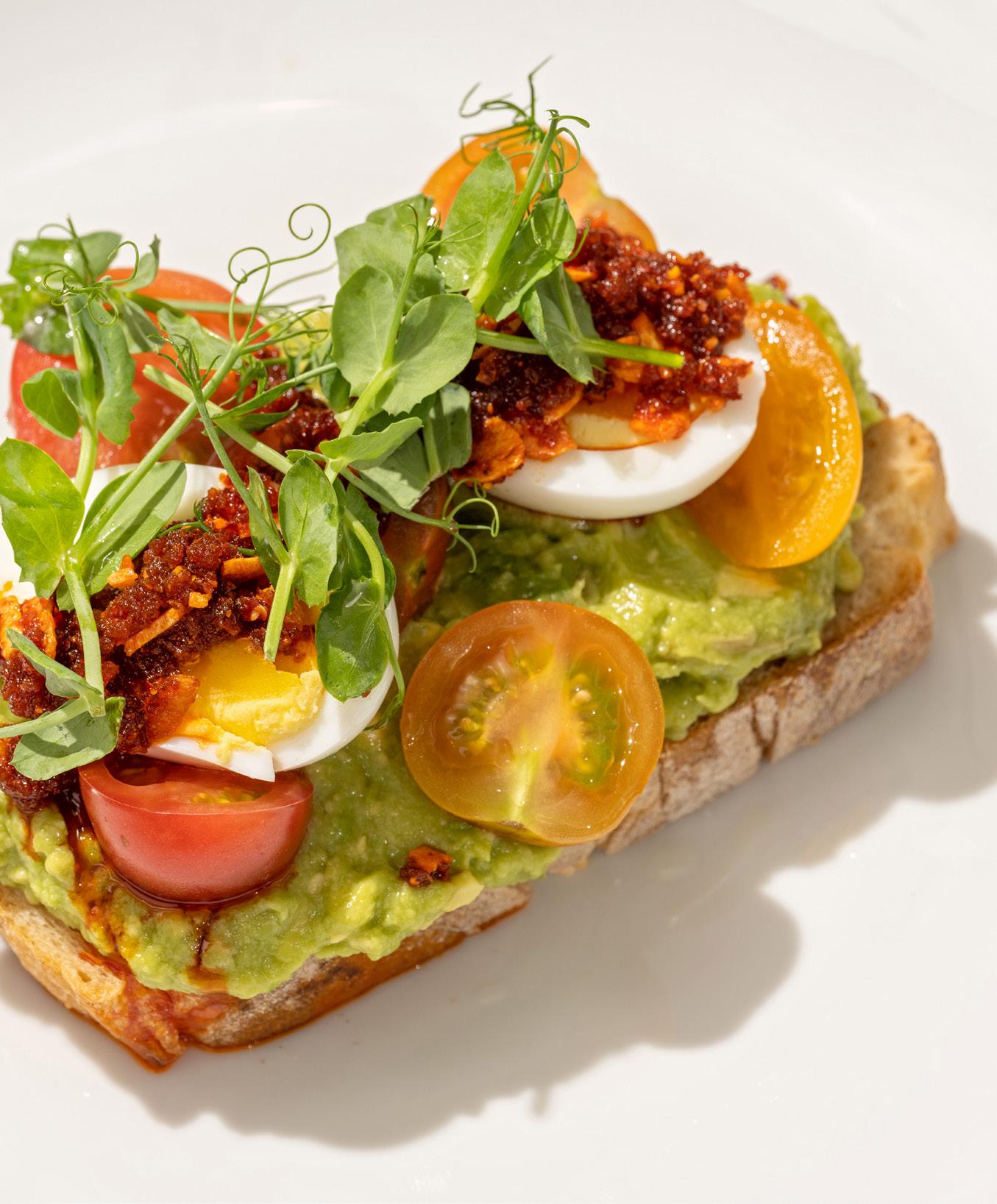 Sublimely simple avocado toast, with heirloom tomatoes, medium-boiled egg, and chili garlic.