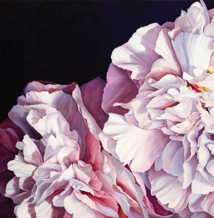 For Carin Gerard, flowers are symbolic of capturing the spirit of the passage of time. She explains, “The flowers I study and paint are living and dying in the same breath, and hold beauty at every stage.” Working in a larger than life scale, Gerard walks back and forth, shifting her view from up close, where she sees the intricacies of the natural form, to afar, where she can take in the monumentality of her subject matter. Gerard’s artistic process is very layered and precise. Early sketchbook notations combine with her Munsell color theory expertise (a precise color method involving a specific equation for each color to create a string of values). Her intense color theory process is complex, but always balanced by her artistic intuition, proficient painterly skills, and innate passion for her subject matter.