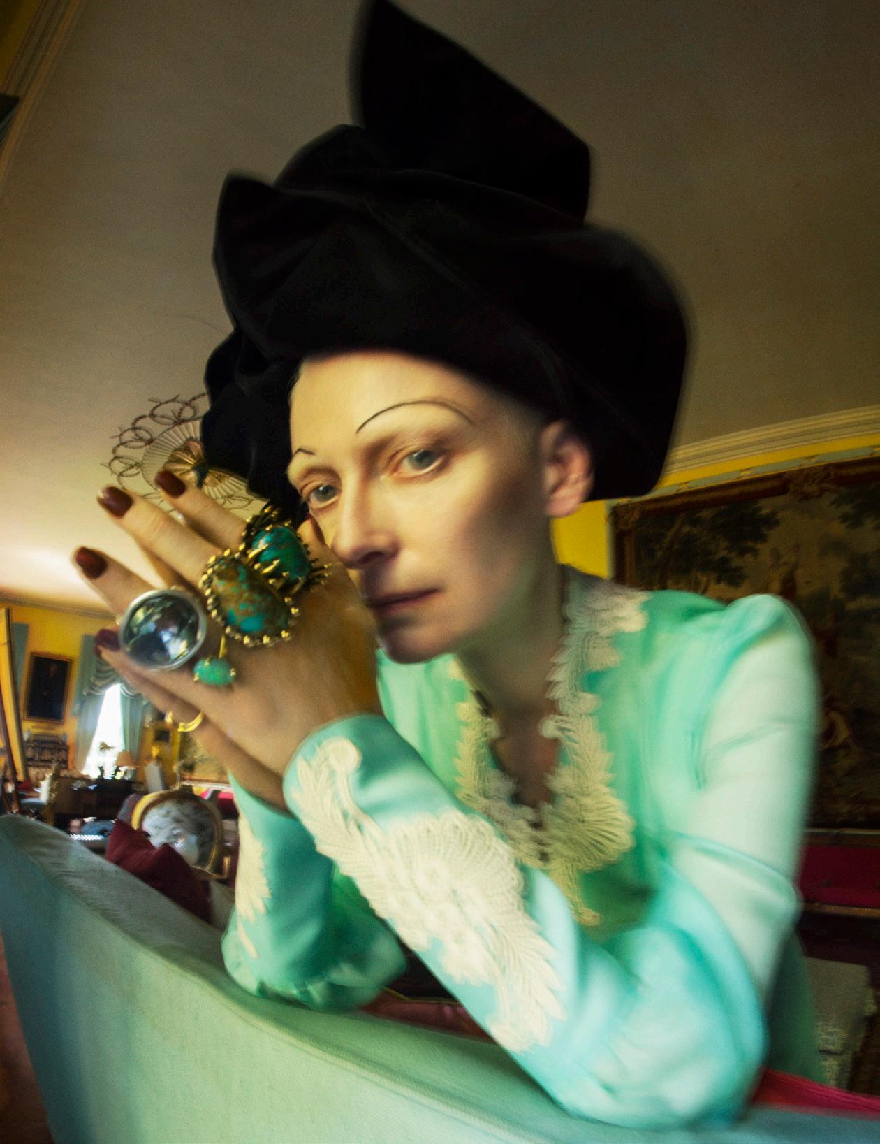 “For this series of portraits, actor Tilda Swinton, who is a distant relative of Edith’s, performed the role of the poet at Renishaw Hall, the Gothic house built by the Sitwell family in the 17th century. Portraits of her ancestors line the staircase, and we were instantly enamored with the beauty of the home and the giant white poppies and purple delphiniums in the garden. These pictures are a celebration of age and individuality—it’s a misconception that beauty is confined to the young. As Edith once said, ‘Why not be oneself?’” —Tim Walker