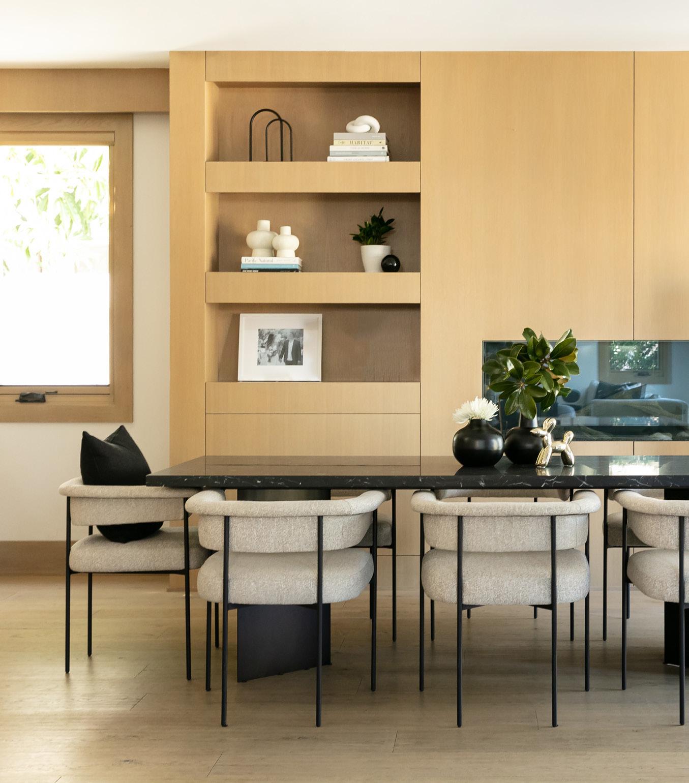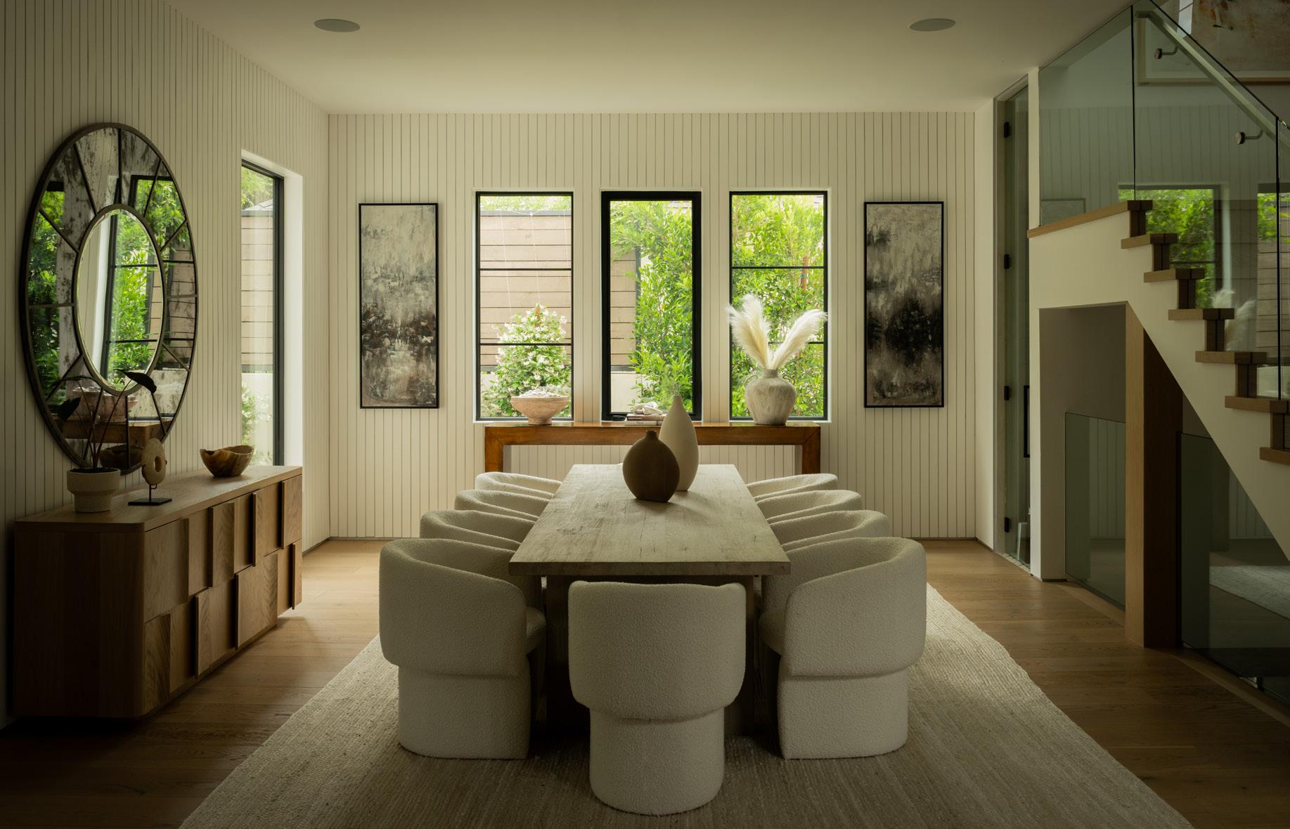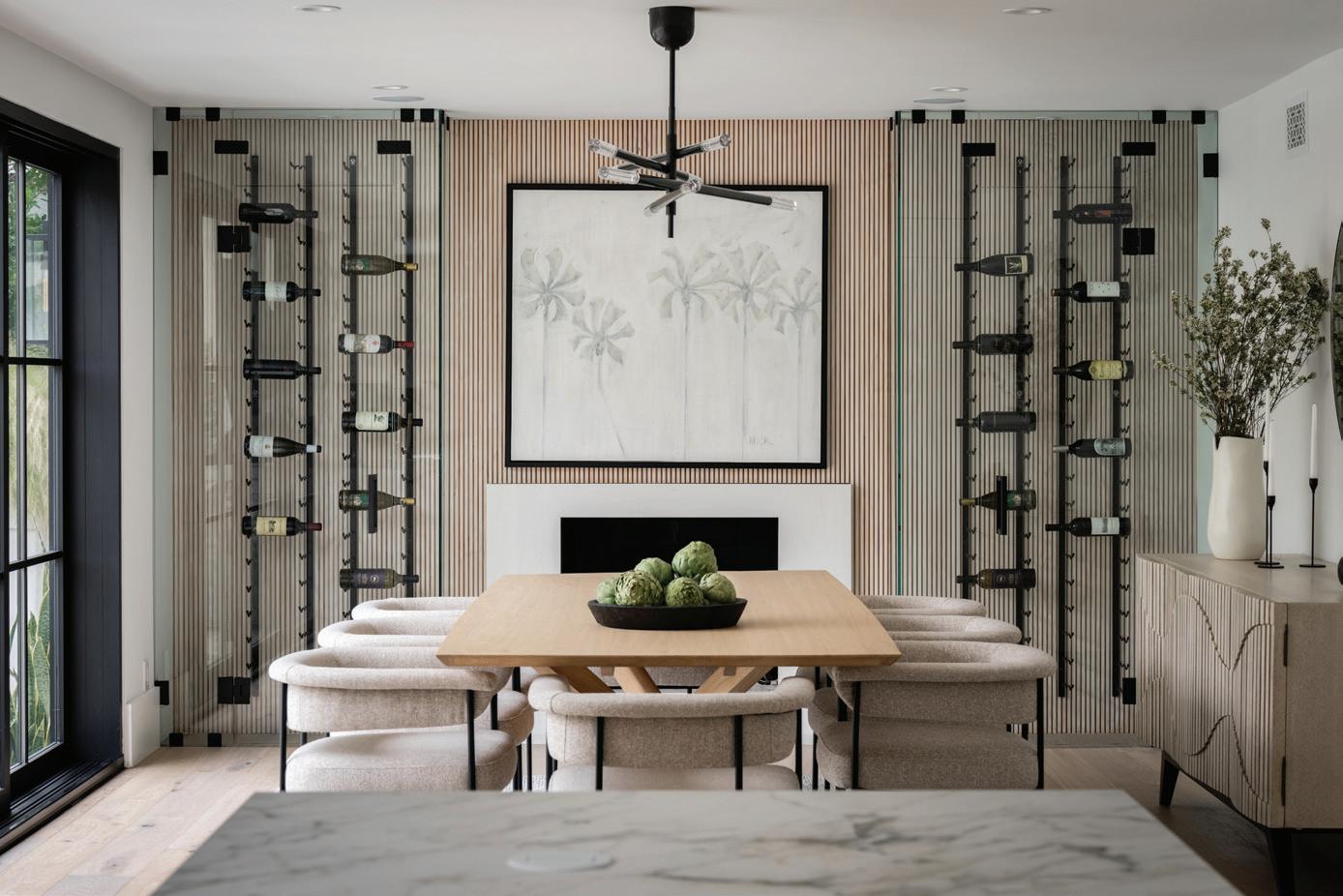 Designed as a vacation home for a family of six from the Bay Area, the property captures the essence of indoor-outdoor living. The layout follows Noppenberger’s signature style of positioning the living spaces around a central courtyard. In this case, one that faces south, inviting natural beauty—including two mature Torrey pines—inside. A spacious pool and outdoor kitchen and dining area with large sliding glass doors opening from the kitchen create a seamless connection between interior and exterior spaces.