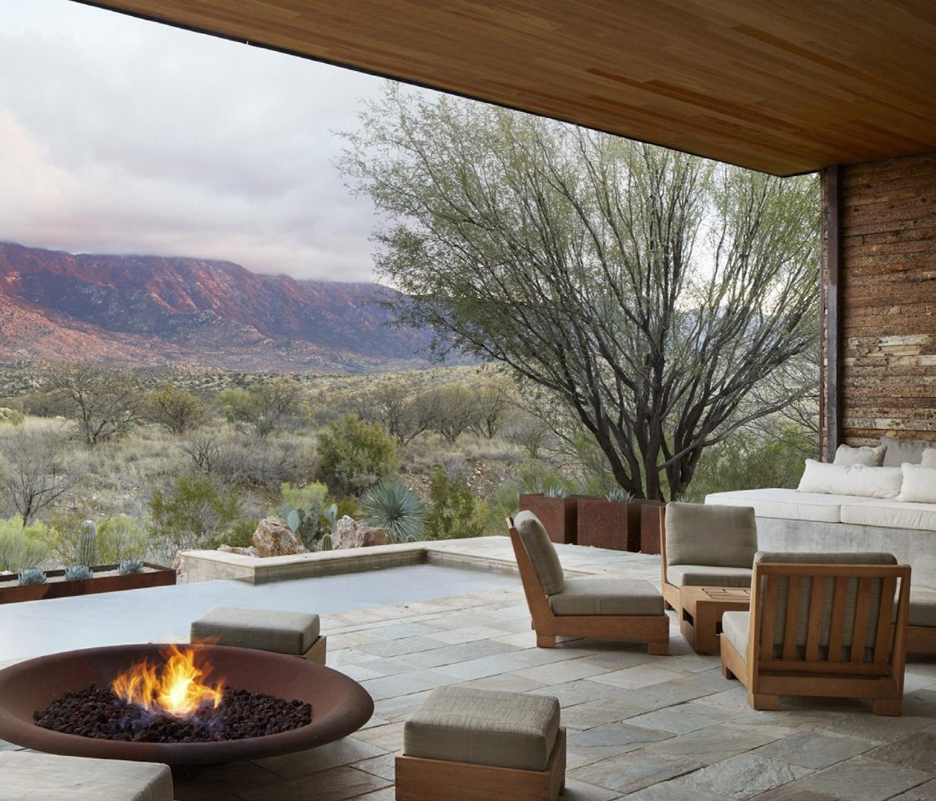 travertine and wood along with a standing-seam metal roof of charcoal gray combine to evoke a certain emotional aspect that blends seamlessly with the site. White stucco walls provide a visual transition between the wood and the stone and provide a canvas for the play of light and shadow from the trees on the property.