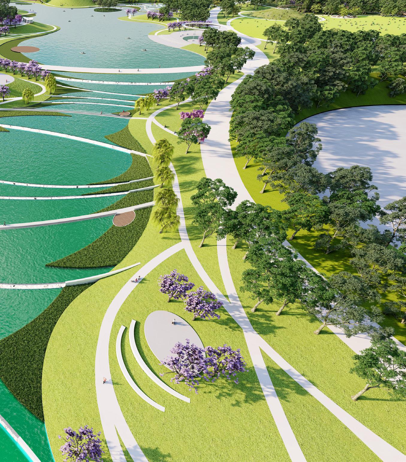 The C-shape layout of the house comprises three wings. The front wing contains the communal areas: kitchen, dining, and family spaces. As you venture further back, a second wing unfolds to reveal five bedrooms, offering a clear separation between private and shared spaces. Between these wings, a transitional area serves as a home office. The house’s design facilitates cross ventilation, enabling natural cooling and optimizing the flow of air. Adding to that are movable, slatted wood screens that allow the owners to modulate privacy and orchestrate the sunlight that comes into the house.