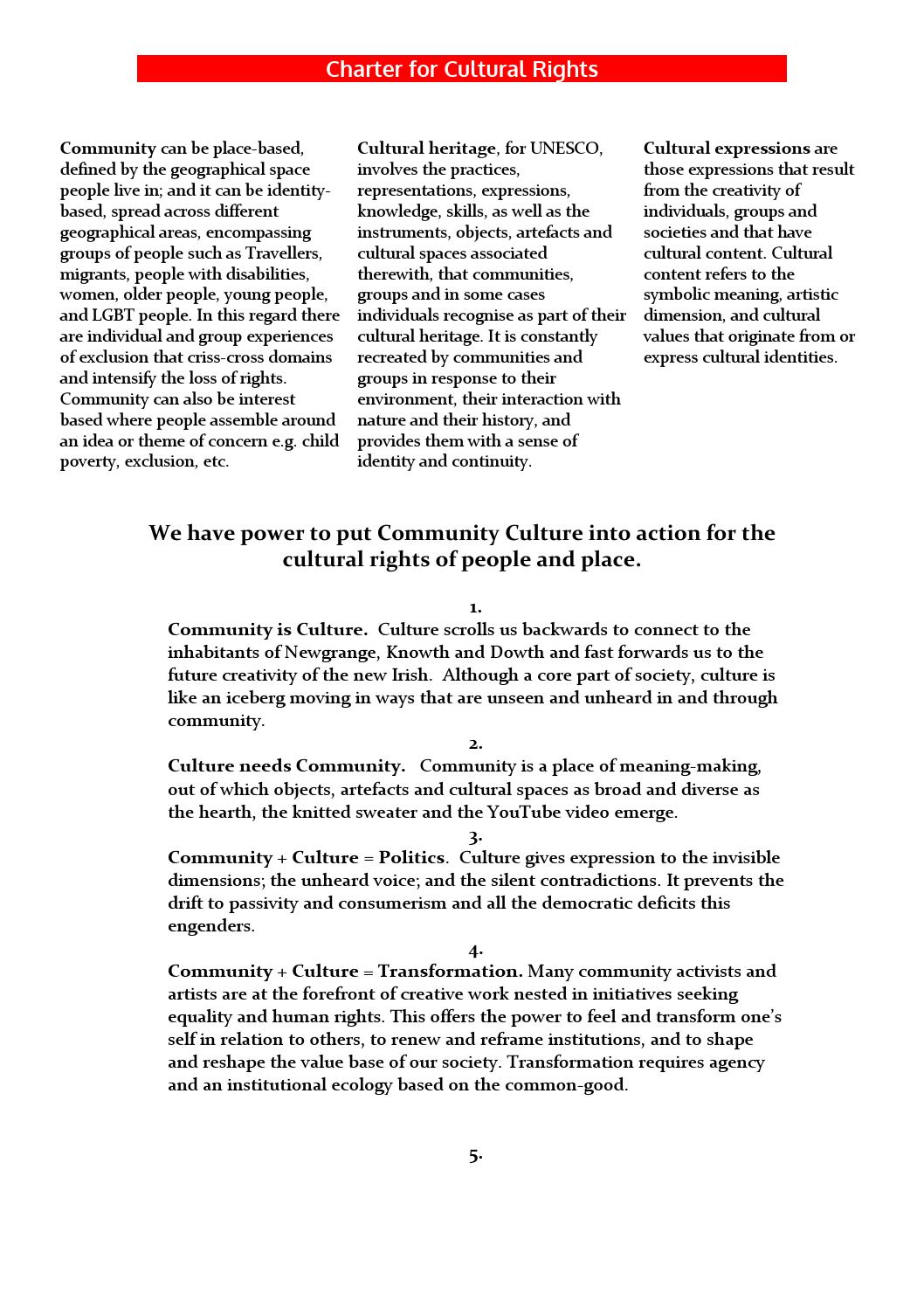We have power to put Community Culture into action for the cultural rights of people and place. 1. Community is Culture. Culture scrolls us backwards to connect to the inhabitants of Newgrange, Knowth and Dowth and fast forwards us to the future creativity of the new Irish. Although a core part of society, culture is like an iceberg moving in ways that are unseen and unheard in and through community. 2. Culture needs Community. Community is a place of meaning-making, out of which objects, artefacts and cultural spaces as broad and diverse as the hearth, the knitted sweater and the YouTube video emerge. 3. Community + Culture = Politics. Culture gives expression to the invisible dimensions; the unheard voice; and the silent contradictions. It prevents the drift to passivity and consumerism and all the democratic deficits this engenders. 4. Community + Culture = Transformation. Many community activists and artists are at the forefront of creative work nested in initiatives seeking equality and human rights. This offers the power to feel and transform one’s self in relation to others, to renew and reframe institutions, and to shape and reshape the value base of our society. Transformation requires agency and an institutional ecology based on the common-good.